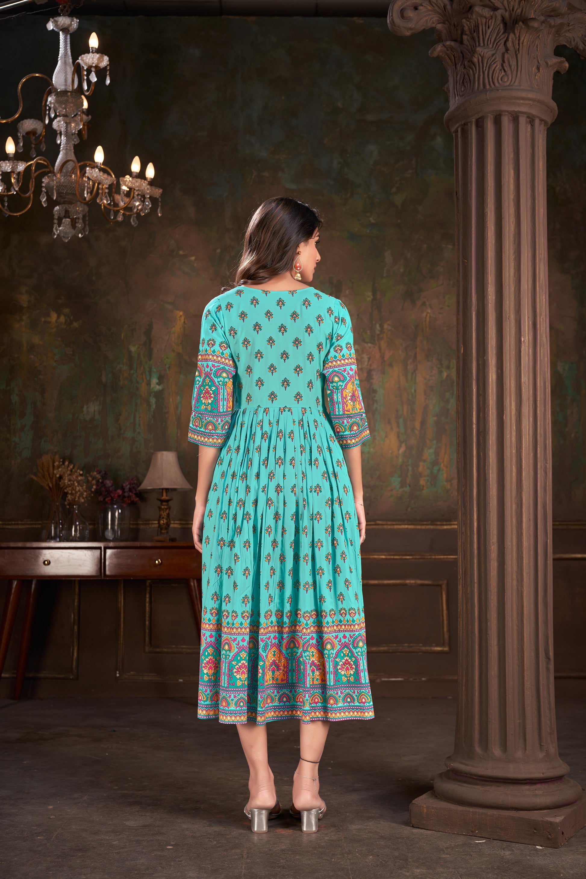 Natural-dyed colours might bleed during the first few washes or rub against the skin & other light-coloured garments. In the artful process of hand block-printing, embroidery work and stitching, variations are likely to come into existence. These irregularities are the hallmark of all handmade products and give each style a unique identity.