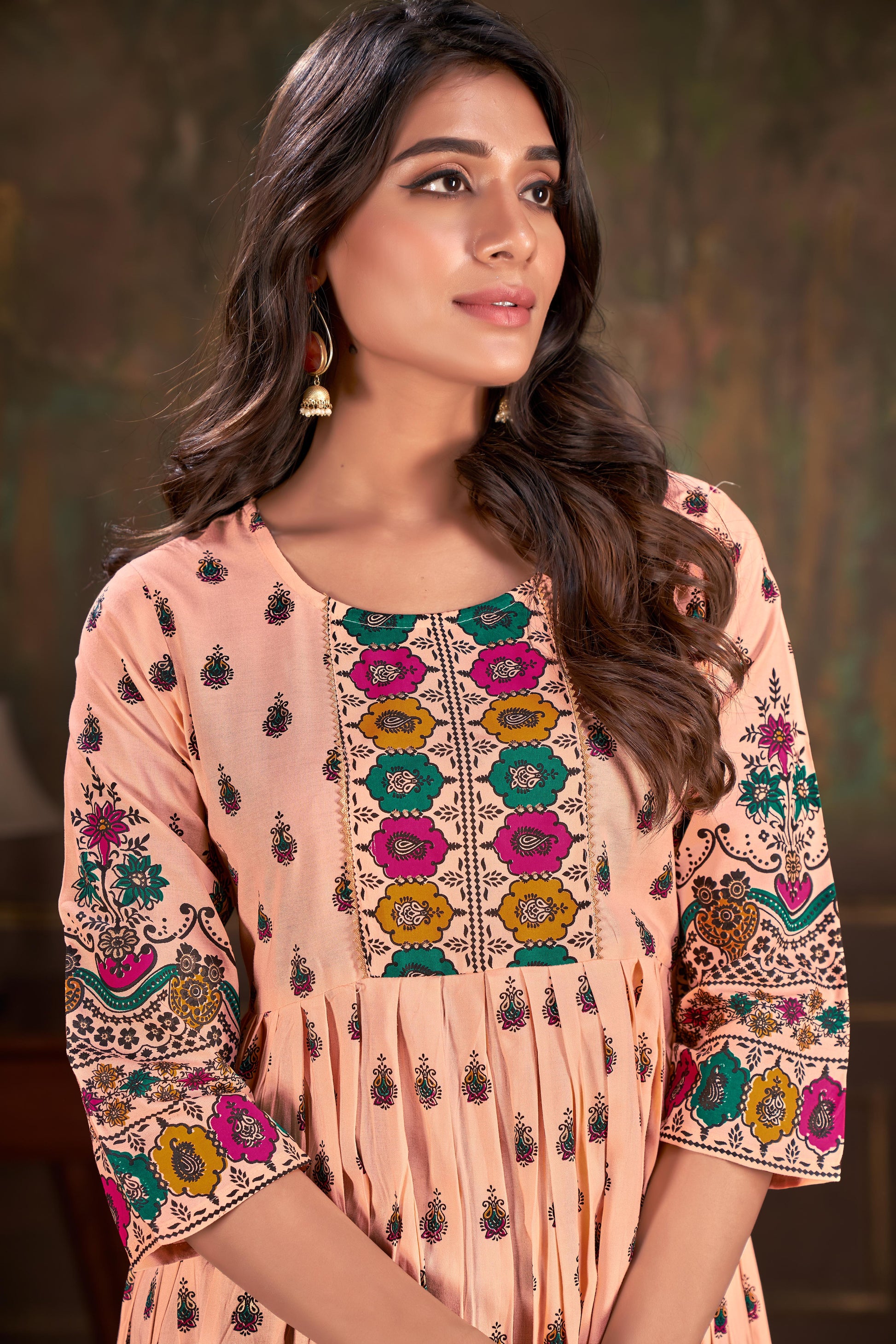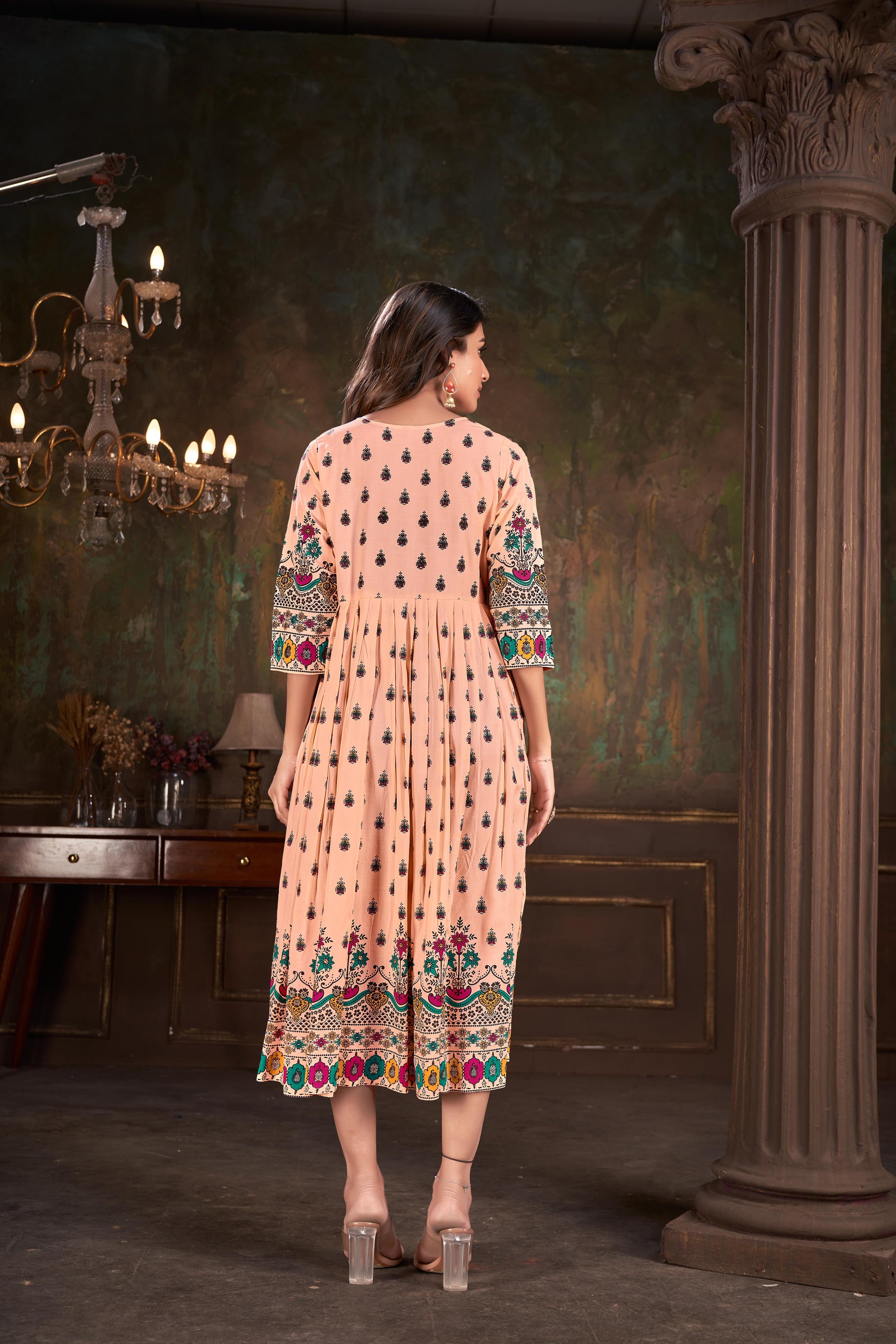 Natural-dyed colours might bleed during the first few washes or rub against the skin & other light-coloured garments. In the artful process of hand block-printing, embroidery work and stitching, variations are likely to come into existence. These irregularities are the hallmark of all handmade products and give each style a unique identity.