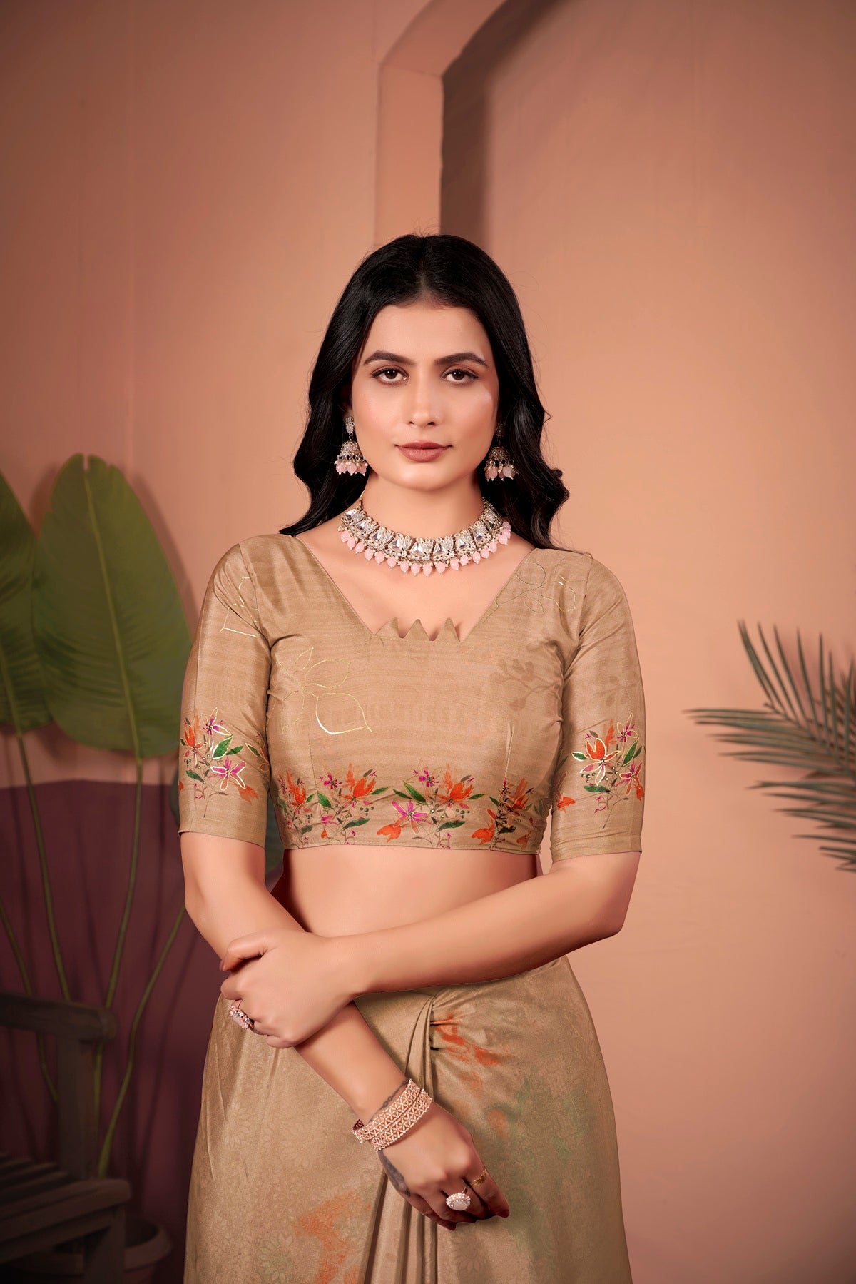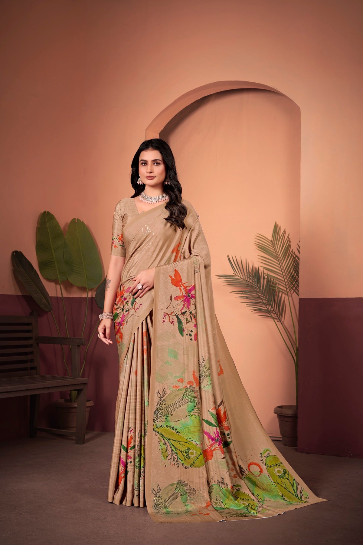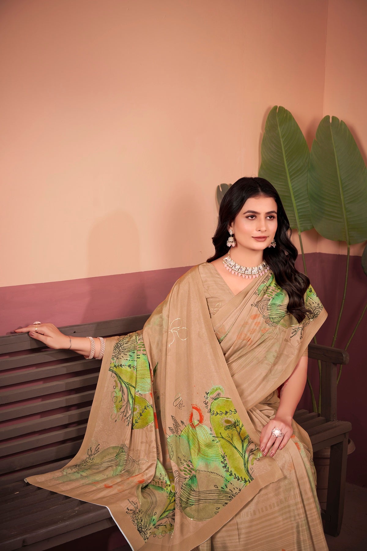 Elegant Beige-Green Saree with Positional Floral Print, Foil Pallu & Floral Border Blouse