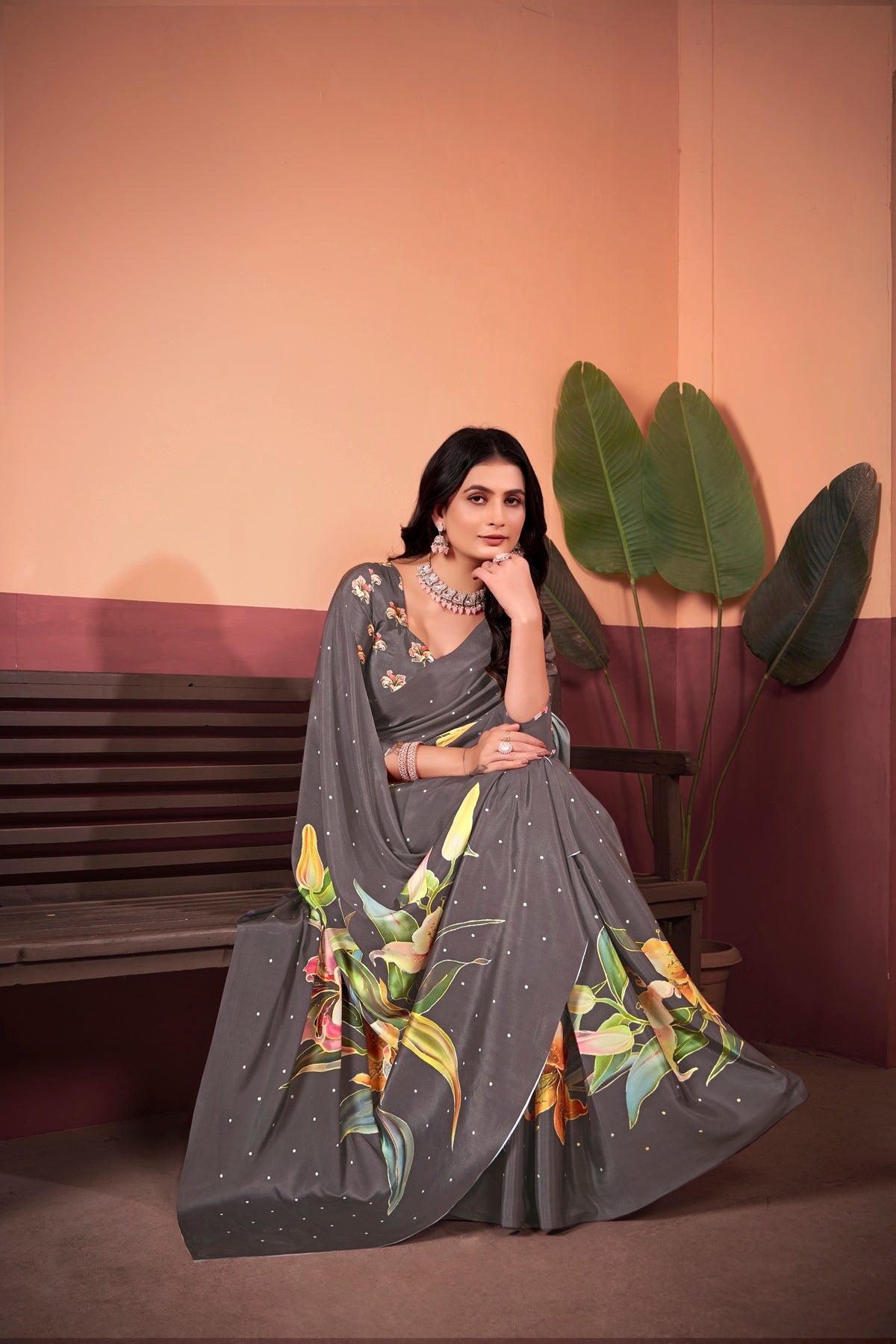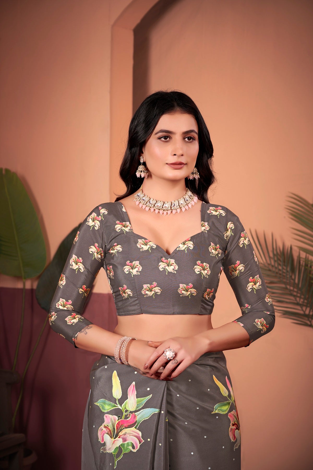 Indulge in timeless elegance with this coffee brown saree, featuring a sophisticated positional floral print and foil detailing that adds a refined shimmer. The rich foil-accented pallu enhances the saree’s beauty, making it perfect for both festive and formal occasions. Paired with a butti ethno floral taste unstitched blouse piece, this saree allows for a customized fit, effortlessly blending traditional craftsmanship with modern grace. Whether for weddings, cultural events, or celebrations, this saree is designed to make a lasting impression.