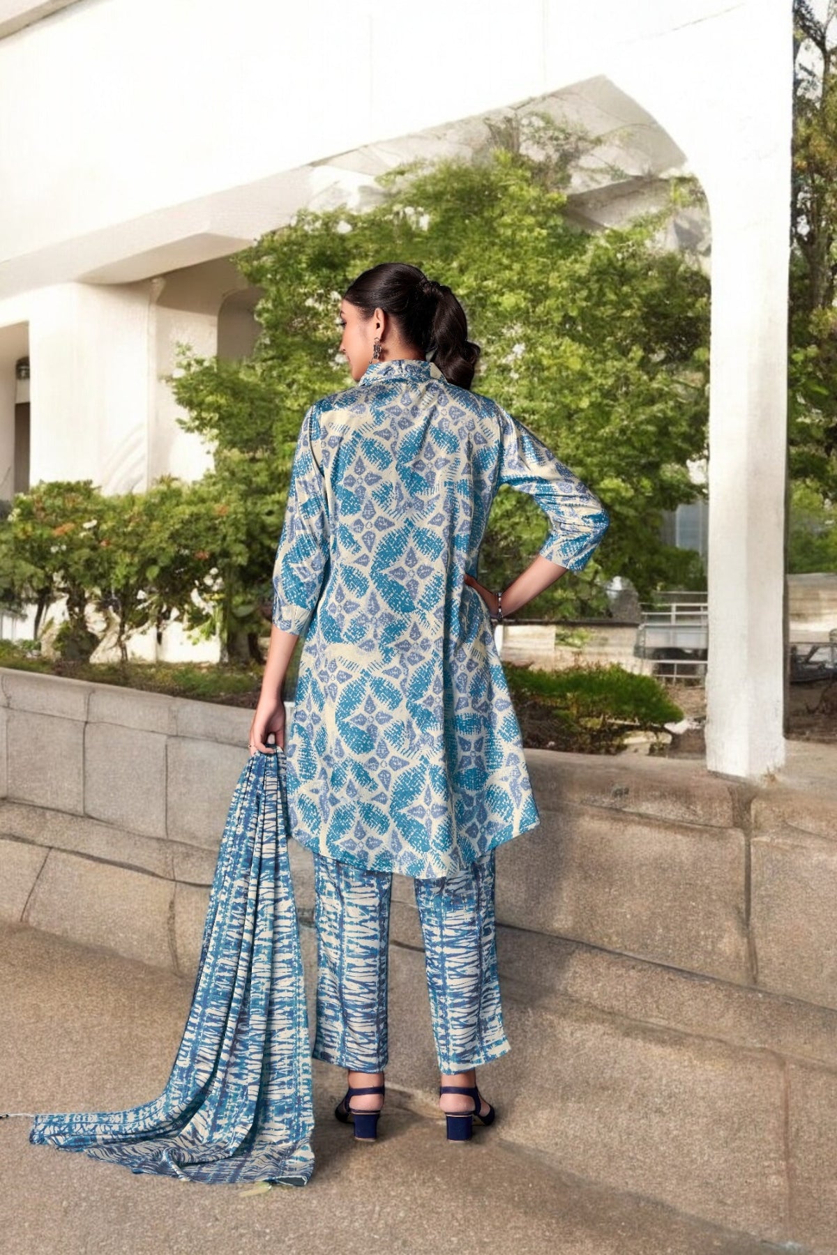 Elegant Crepe Silk Co-Ord Set with Pastel Floral Digital Print & Matching Scarf -Beige