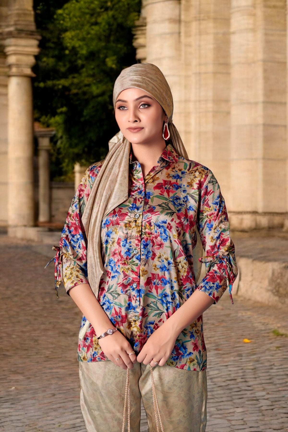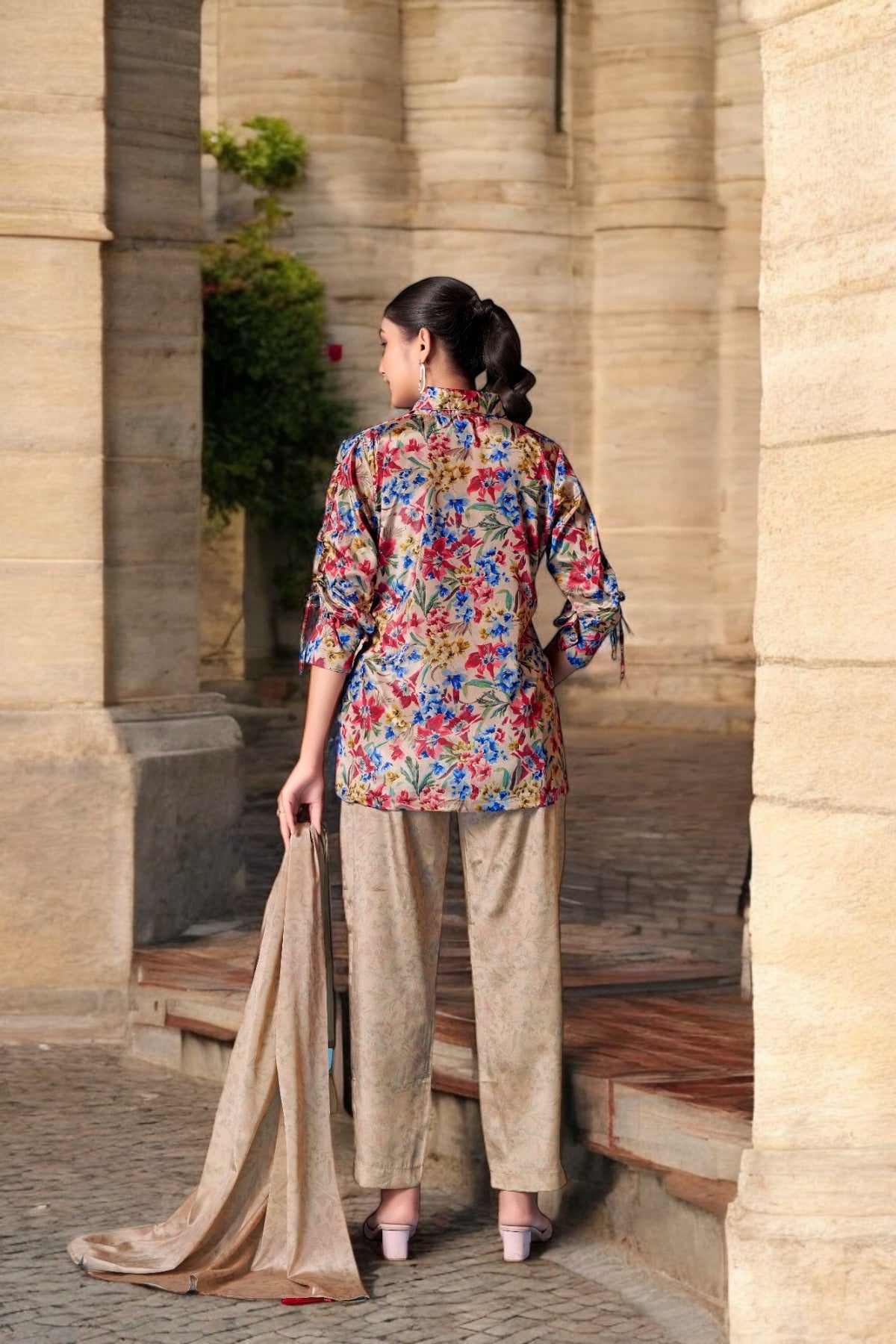 Elegant Crepe Silk Co-Ord Set with Pastel Floral Digital Print & Matching Scarf-Beige