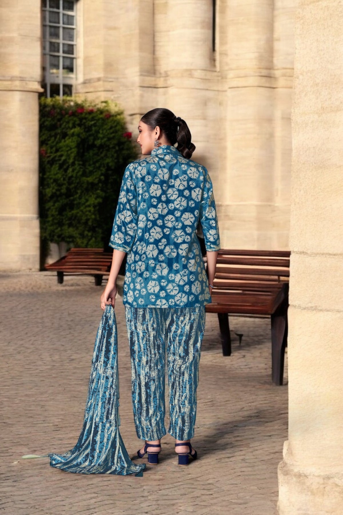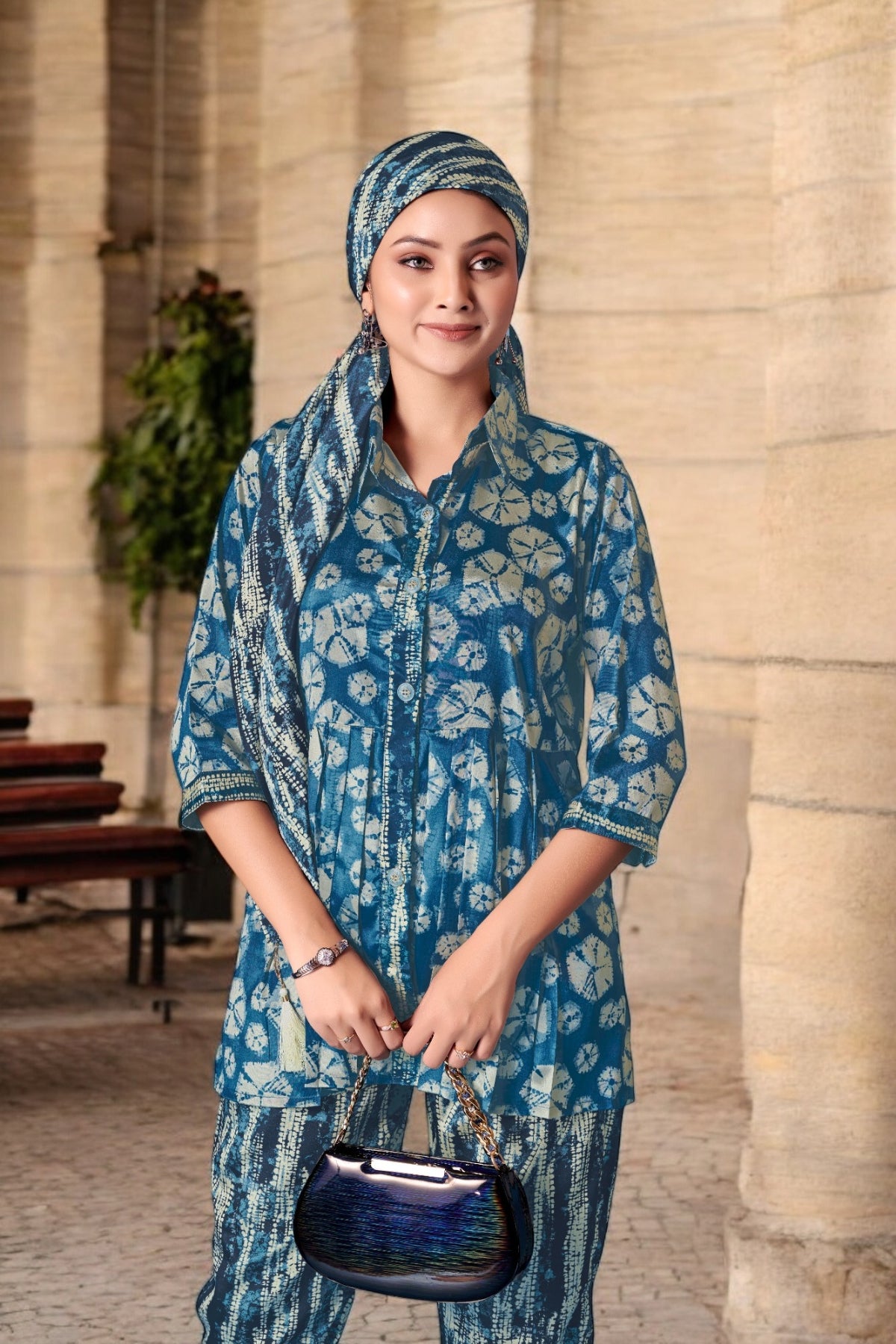 Elegant Crepe Silk Co-Ord Set with Pastel Floral Digital Print & Matching Scarf-Dark Blue