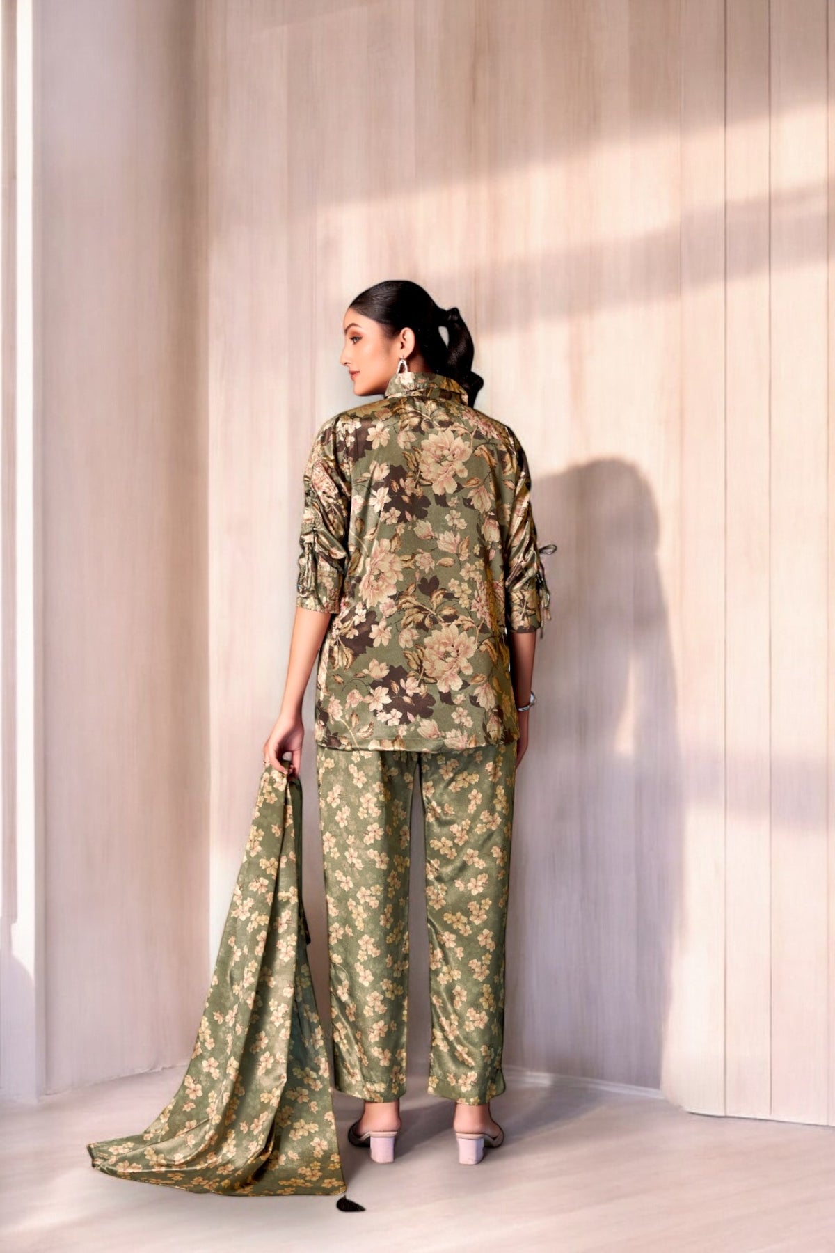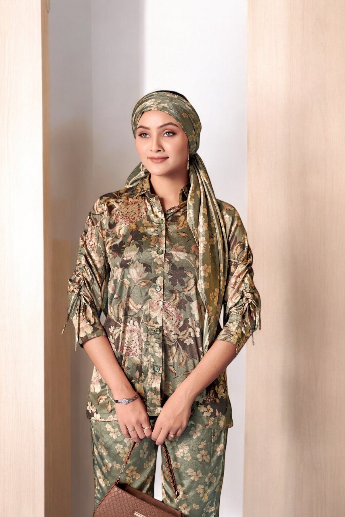 Elegant Crepe Silk Co-Ord Set with Pastel Floral Digital Print & Matching Scarf -Dark Green