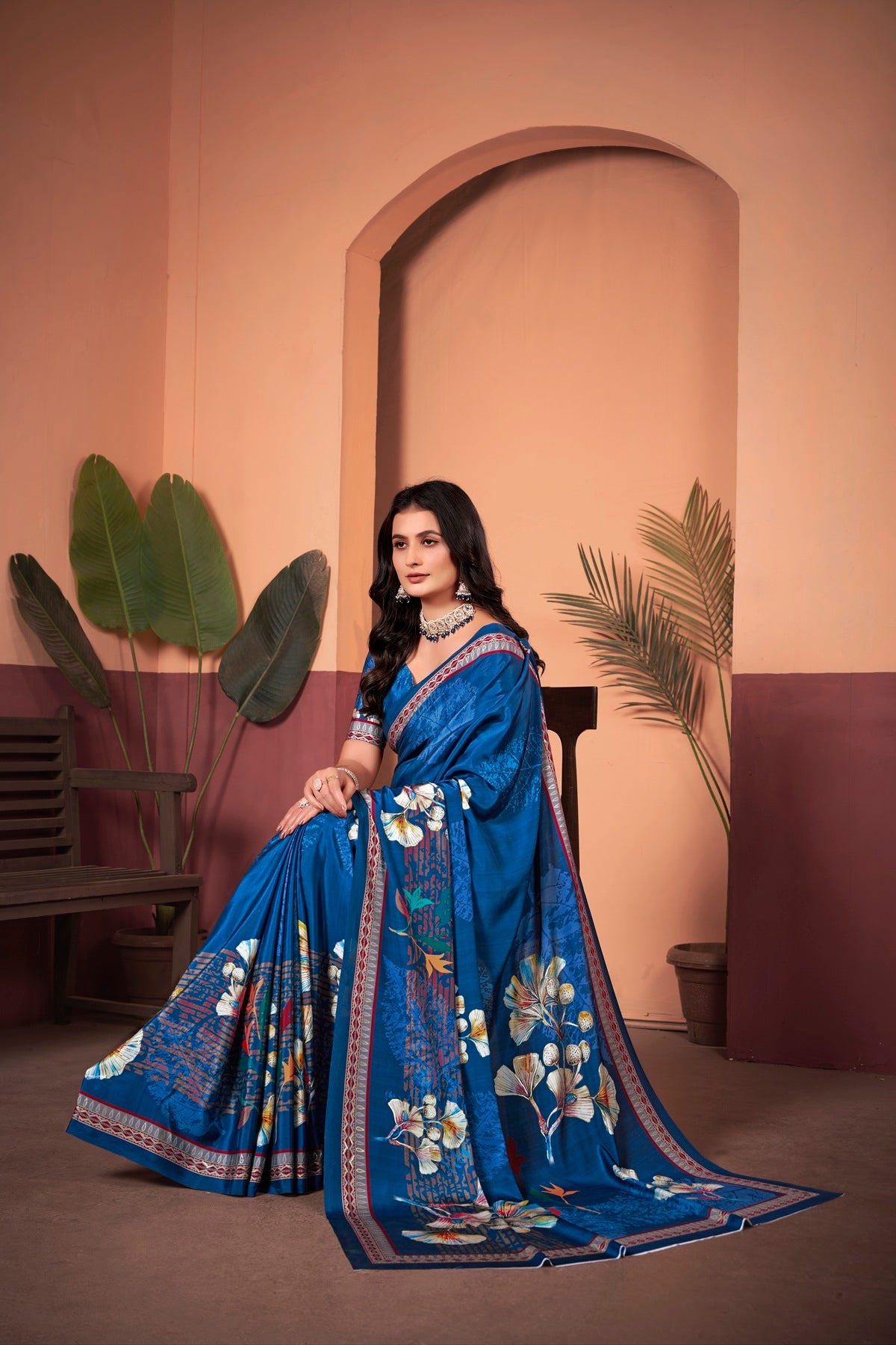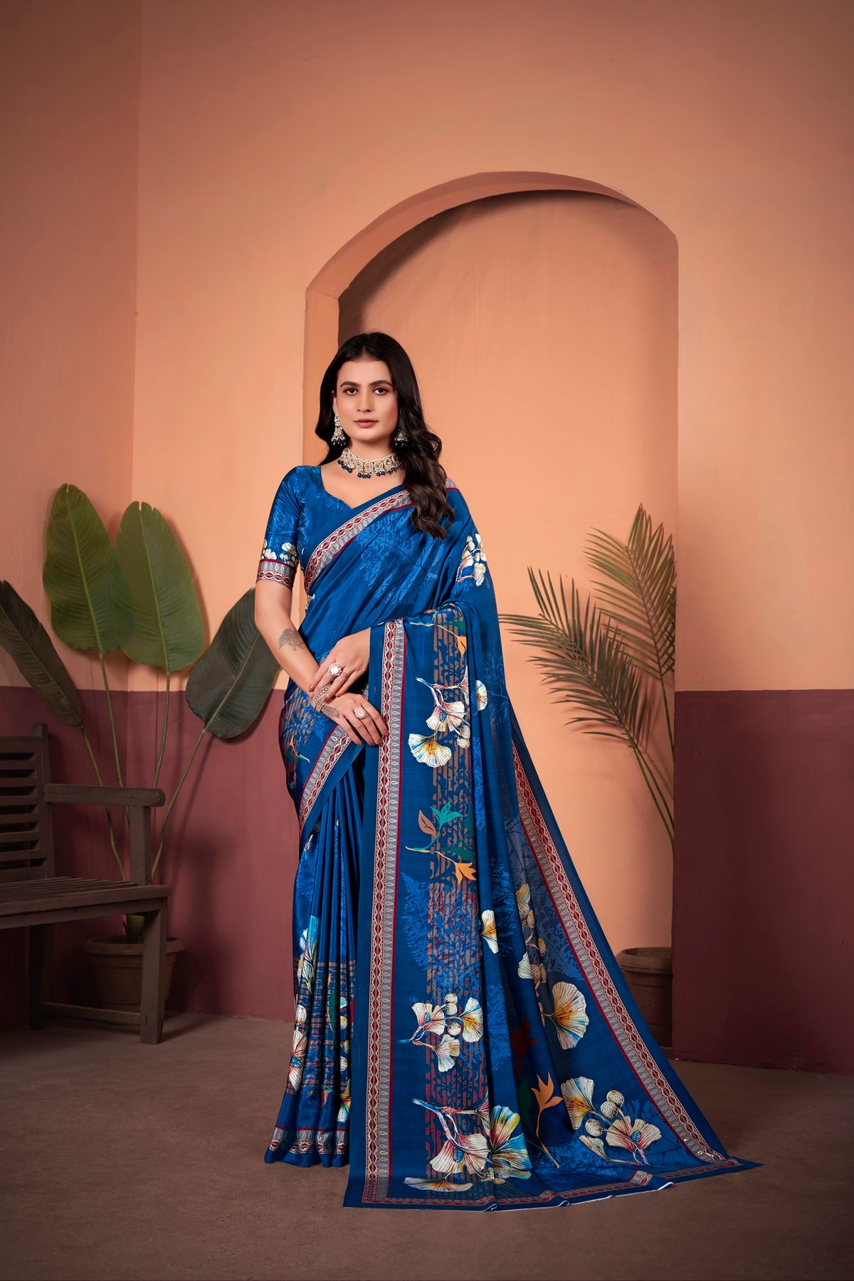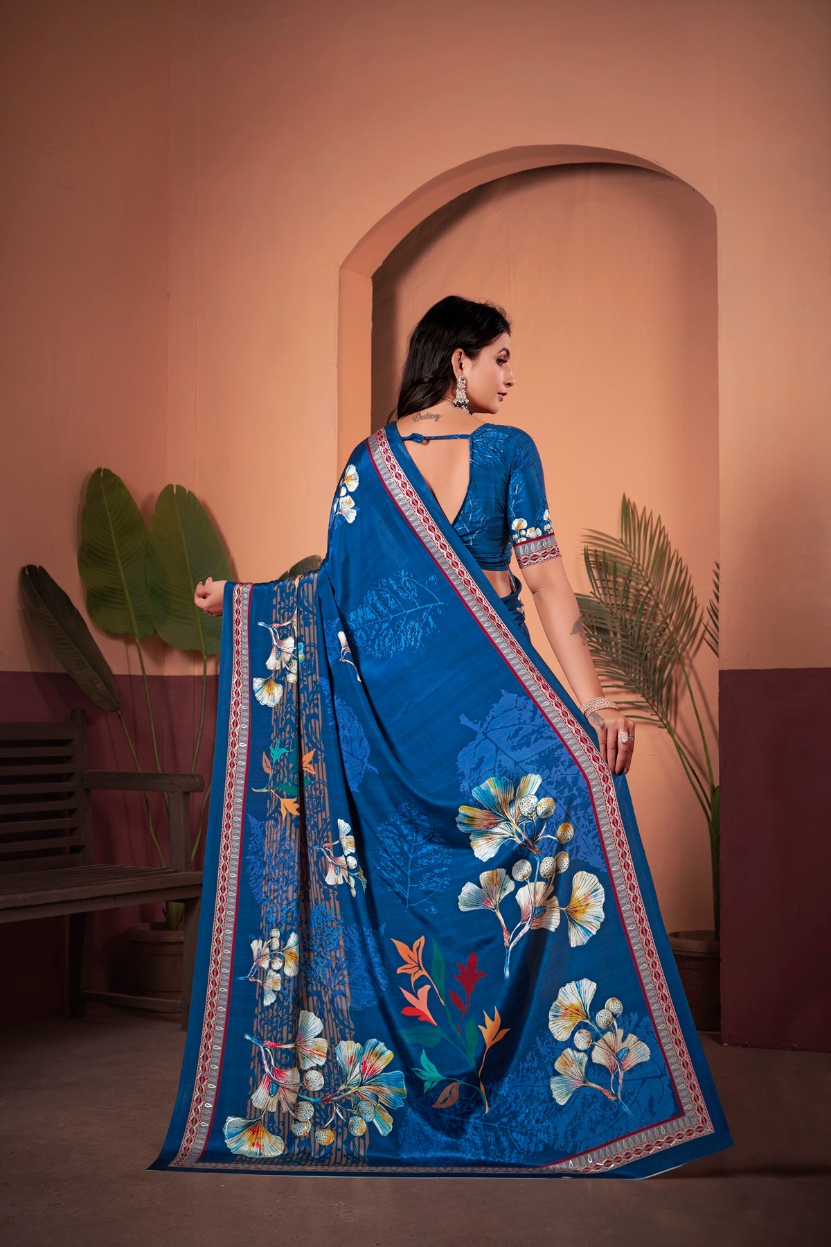 Exquisite Royal Blue Saree with Positional Floral Print & Foil-Embellished Pallu