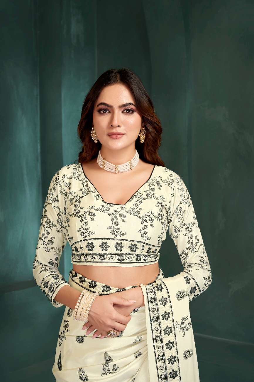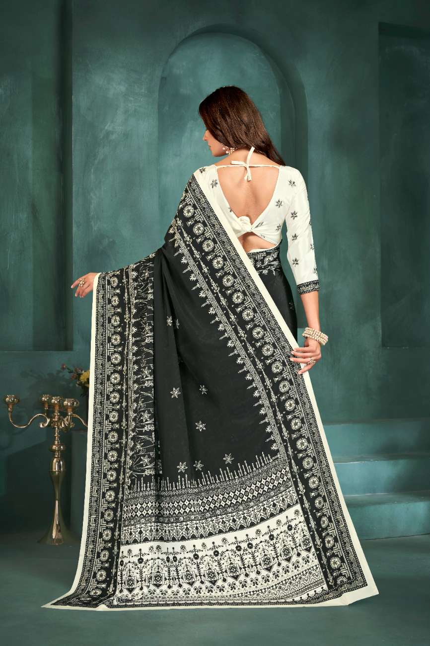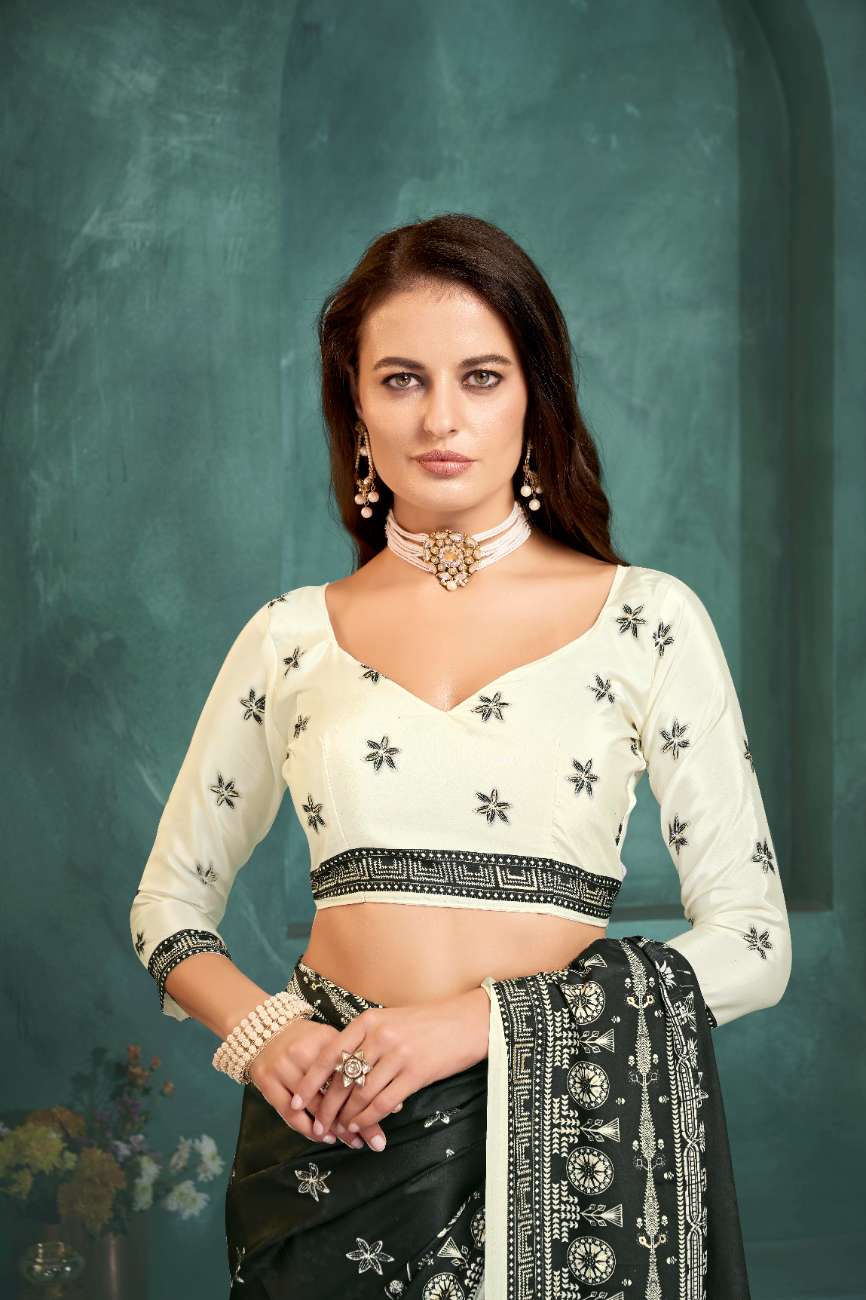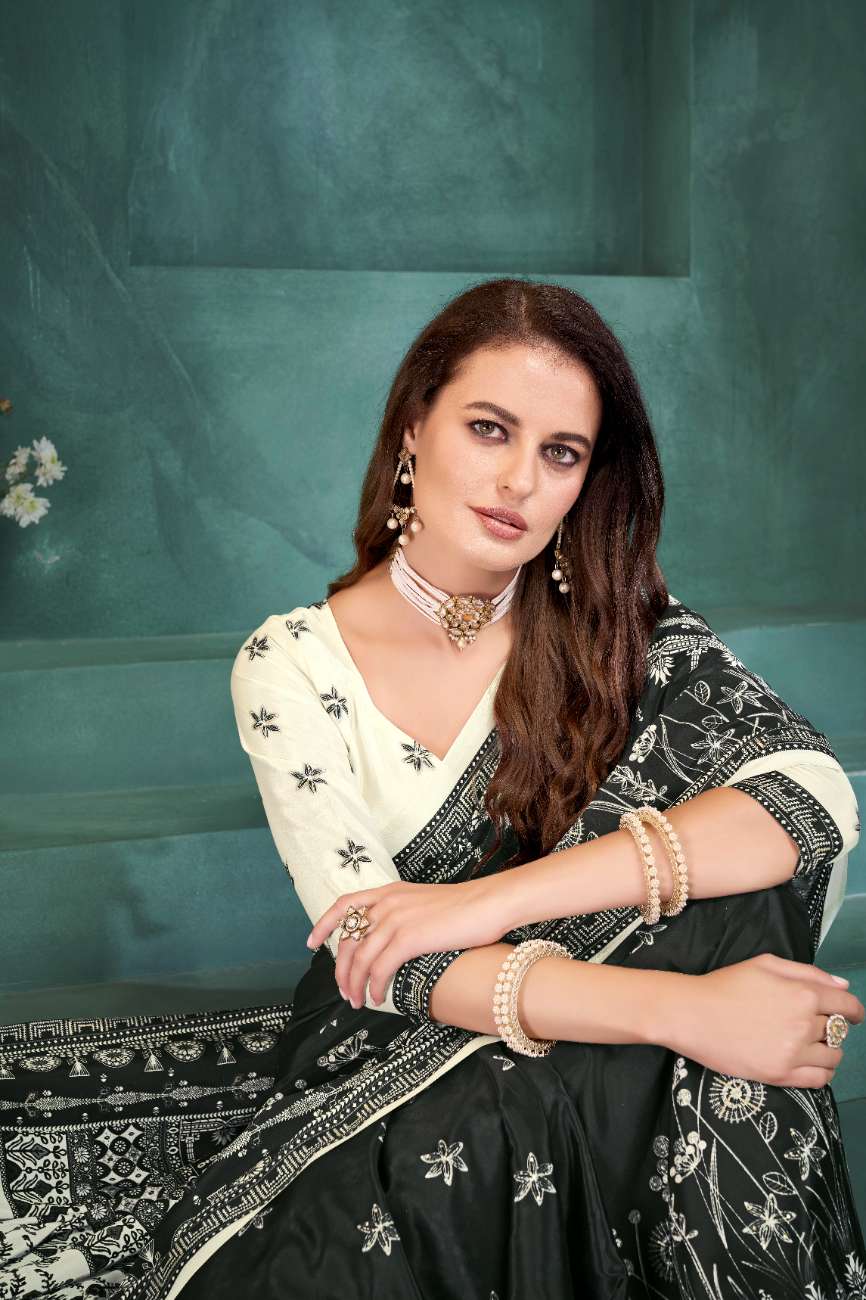 The rich drape of crepe silk perfectly complements the intricate foil detailing, creating a sophisticated silhouette that’s both traditional and contemporary. Whether you choose the bold black or the pristine white, GRACE is designed to make a statement at every celebration.