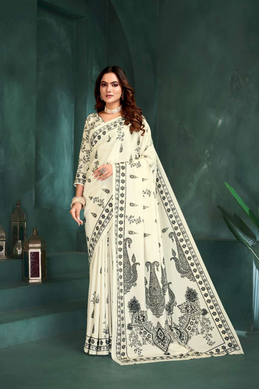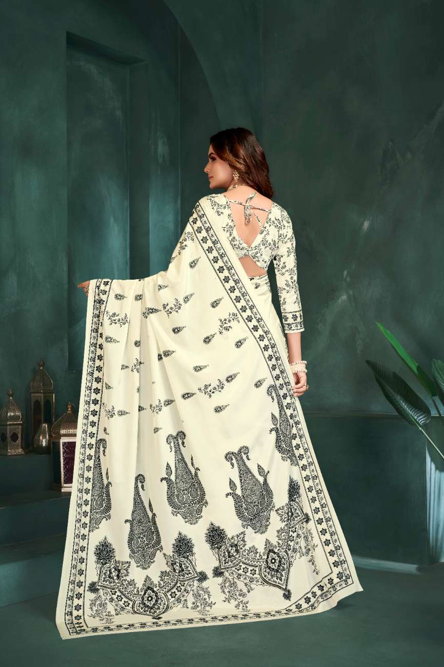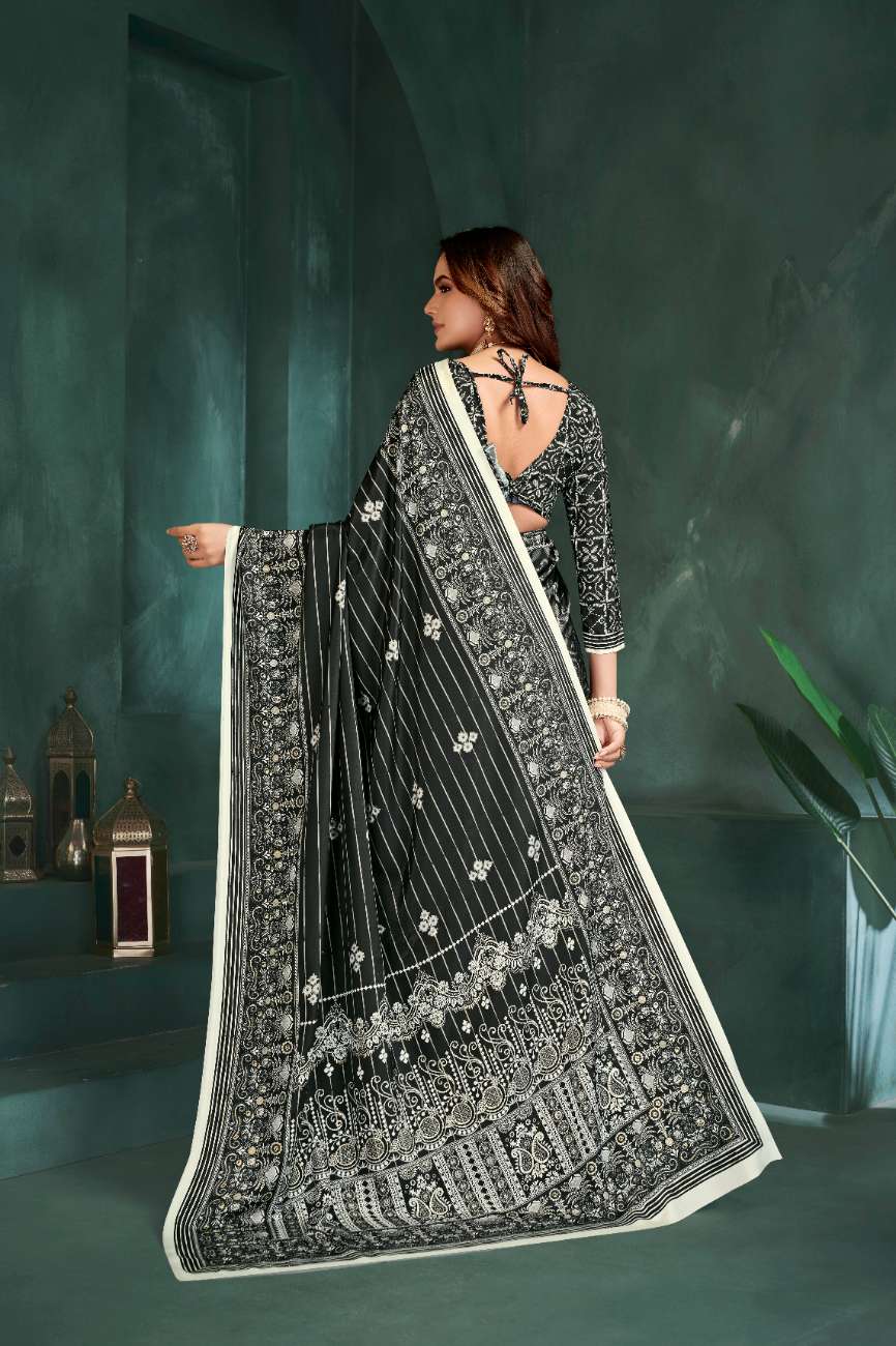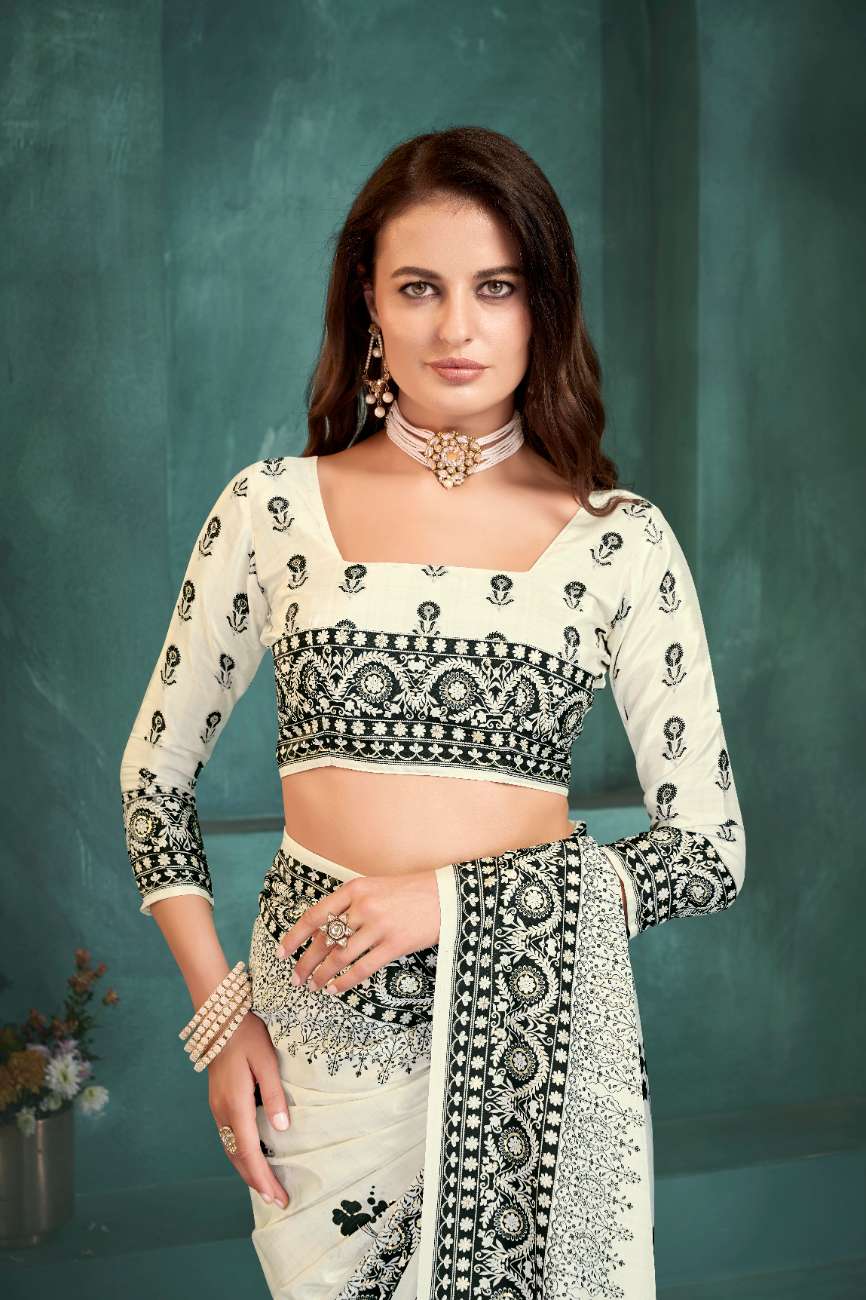 The rich drape of crepe silk perfectly complements the intricate foil detailing, creating a sophisticated silhouette that’s both traditional and contemporary. Whether you choose the bold black or the pristine white, GRACE is designed to make a statement at every celebration.
