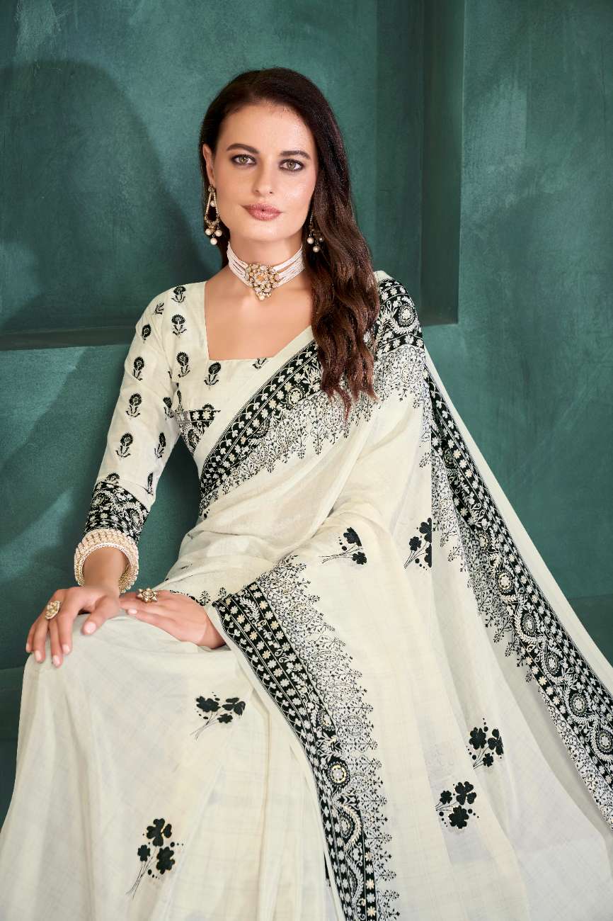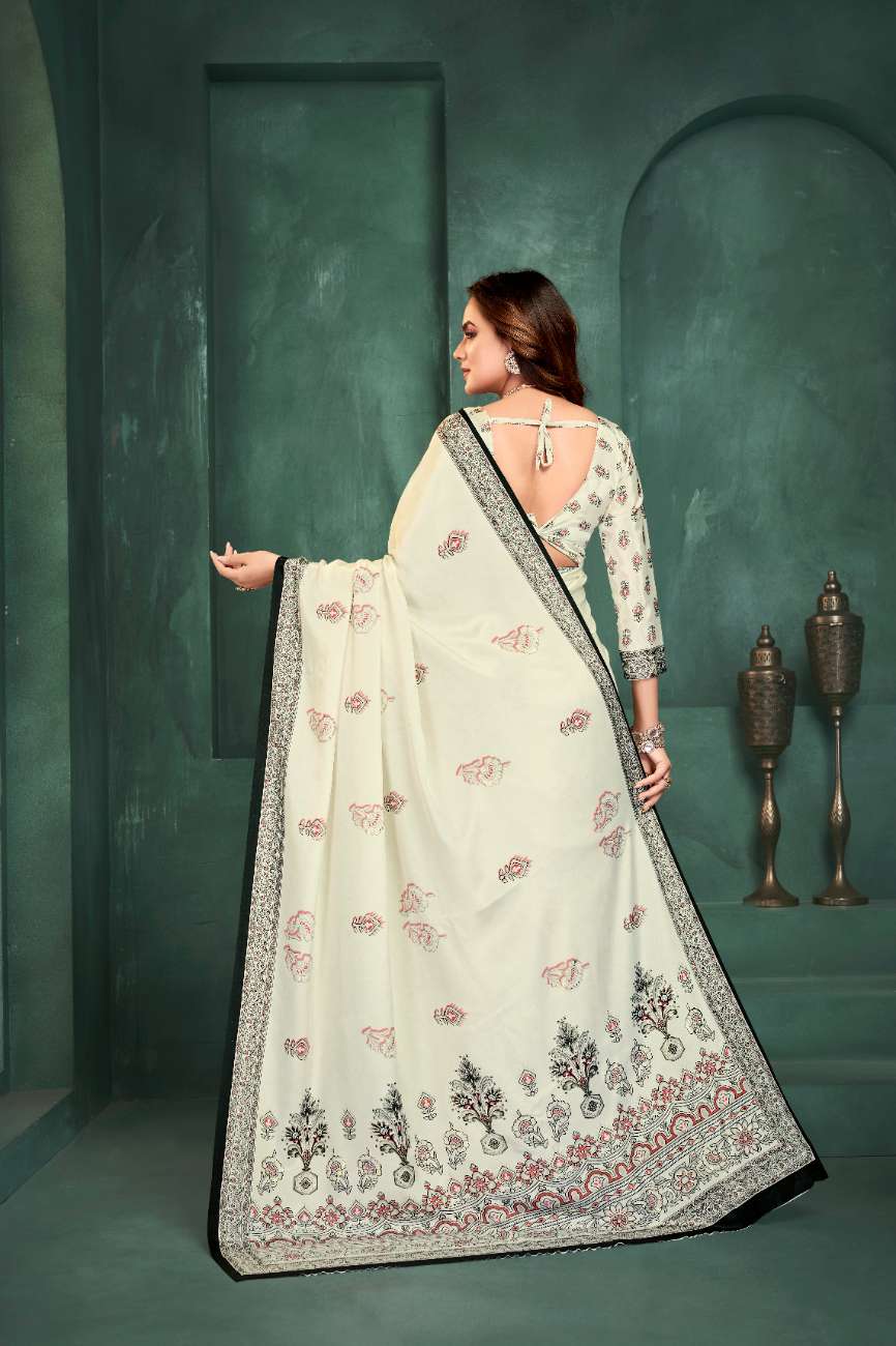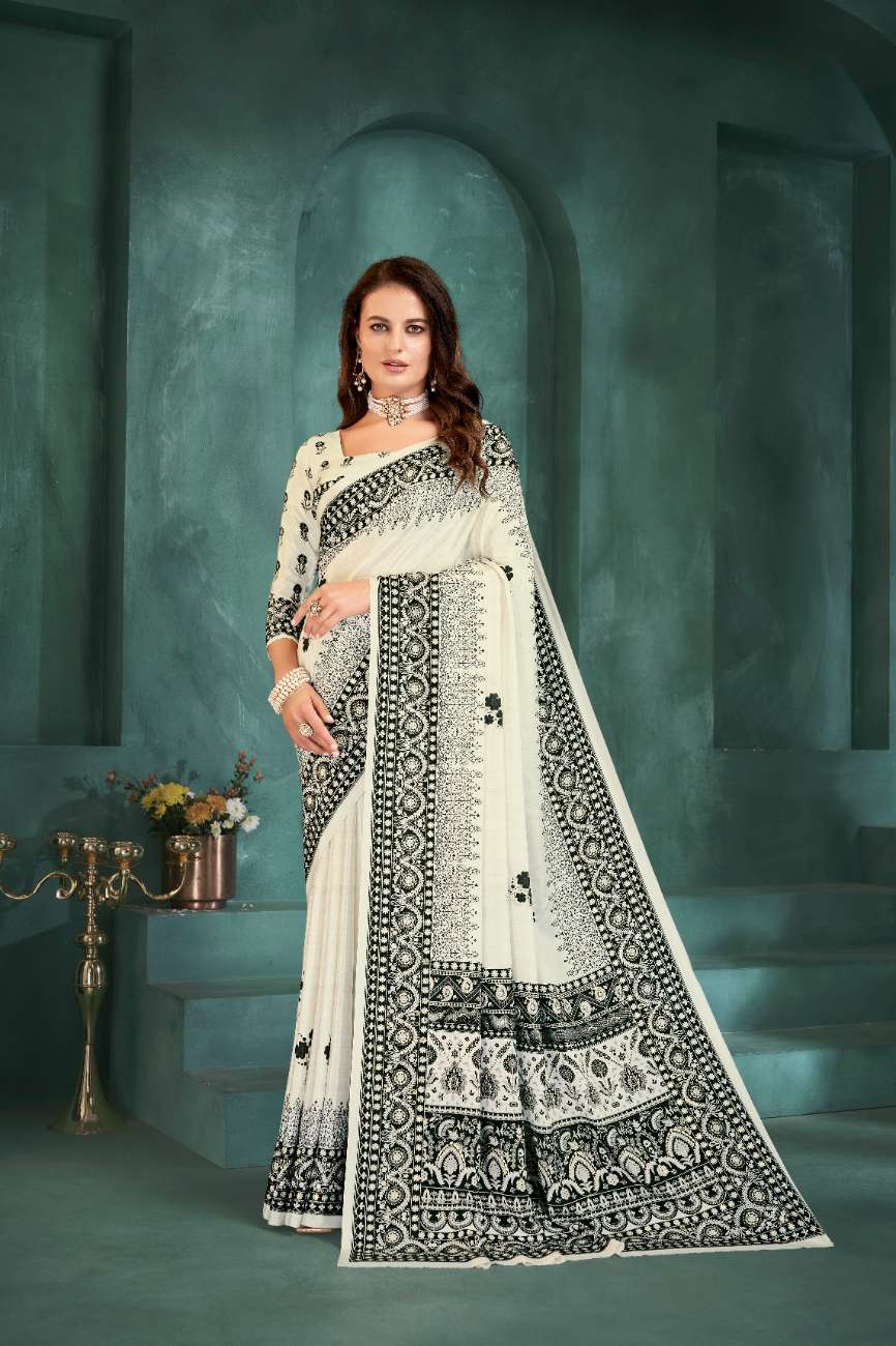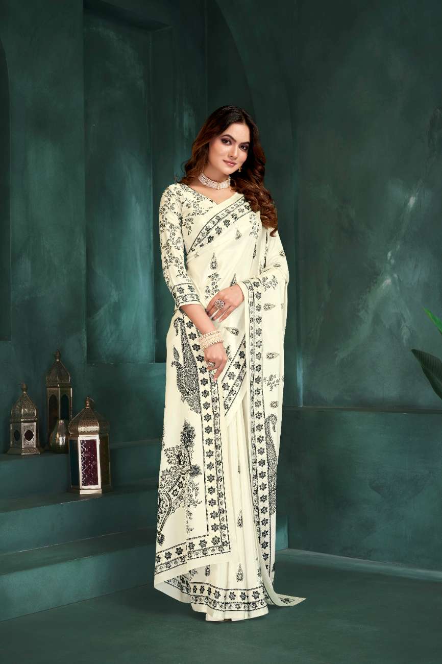 The rich drape of crepe silk perfectly complements the intricate foil detailing, creating a sophisticated silhouette that’s both traditional and contemporary. Whether you choose the bold black or the pristine white, GRACE is designed to make a statement at every celebration.