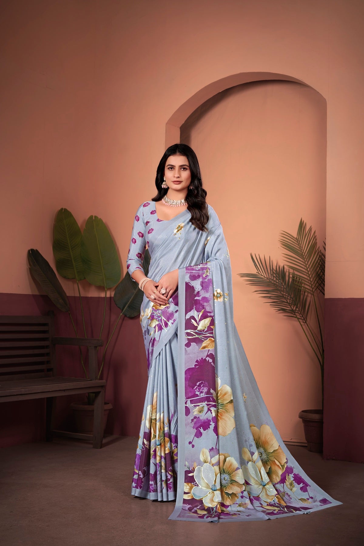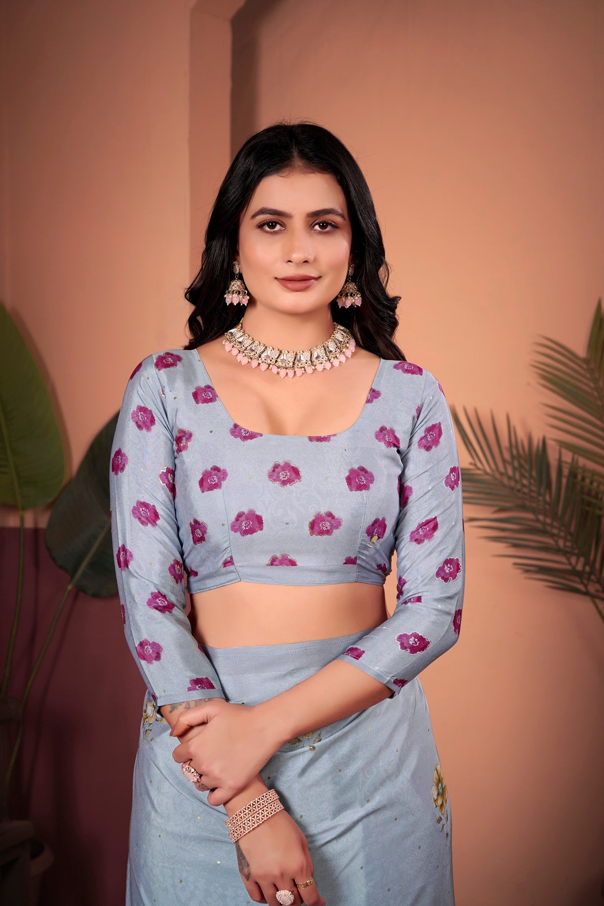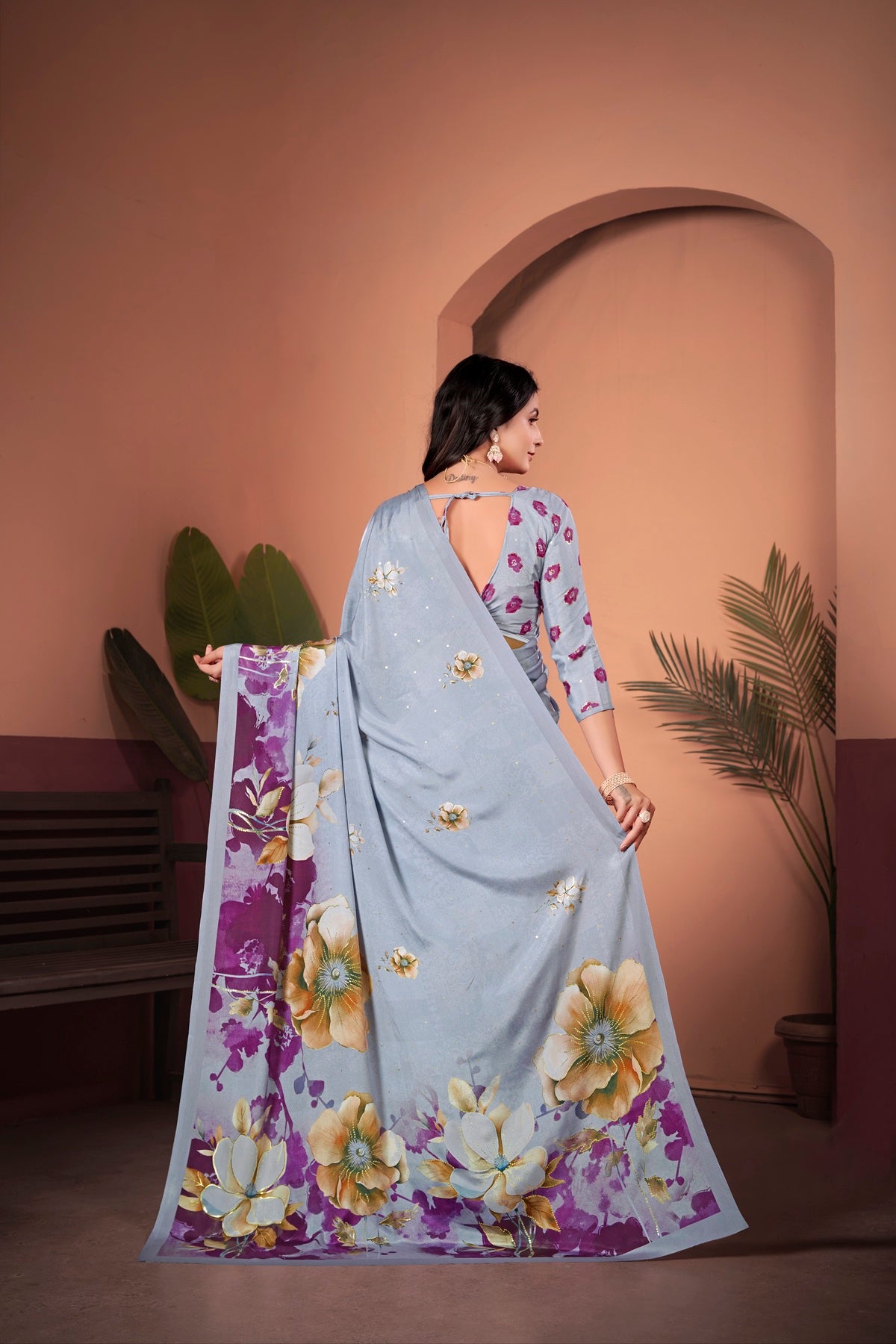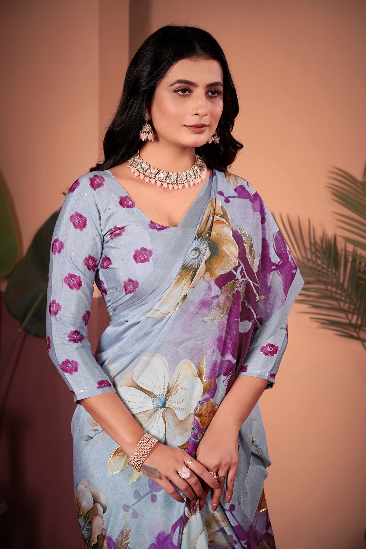 Graceful Lilac Grey Saree with Positional Floral Print & Foil Detailing
