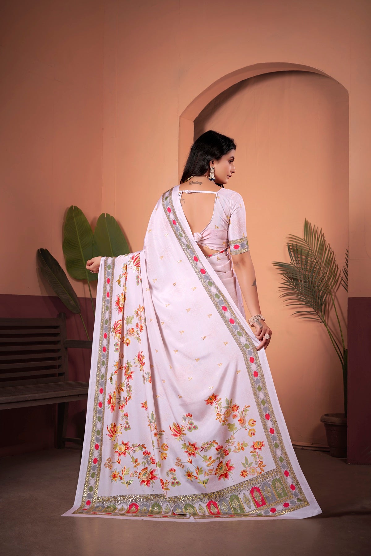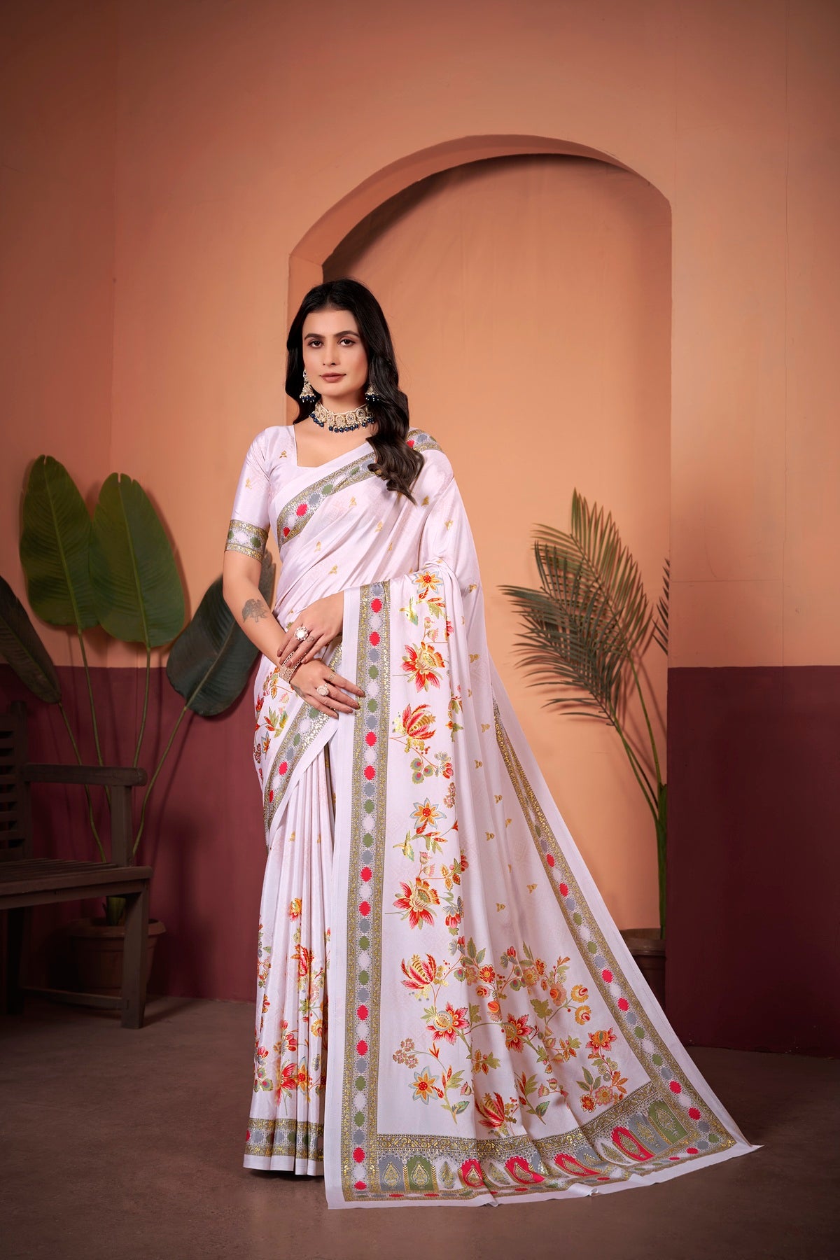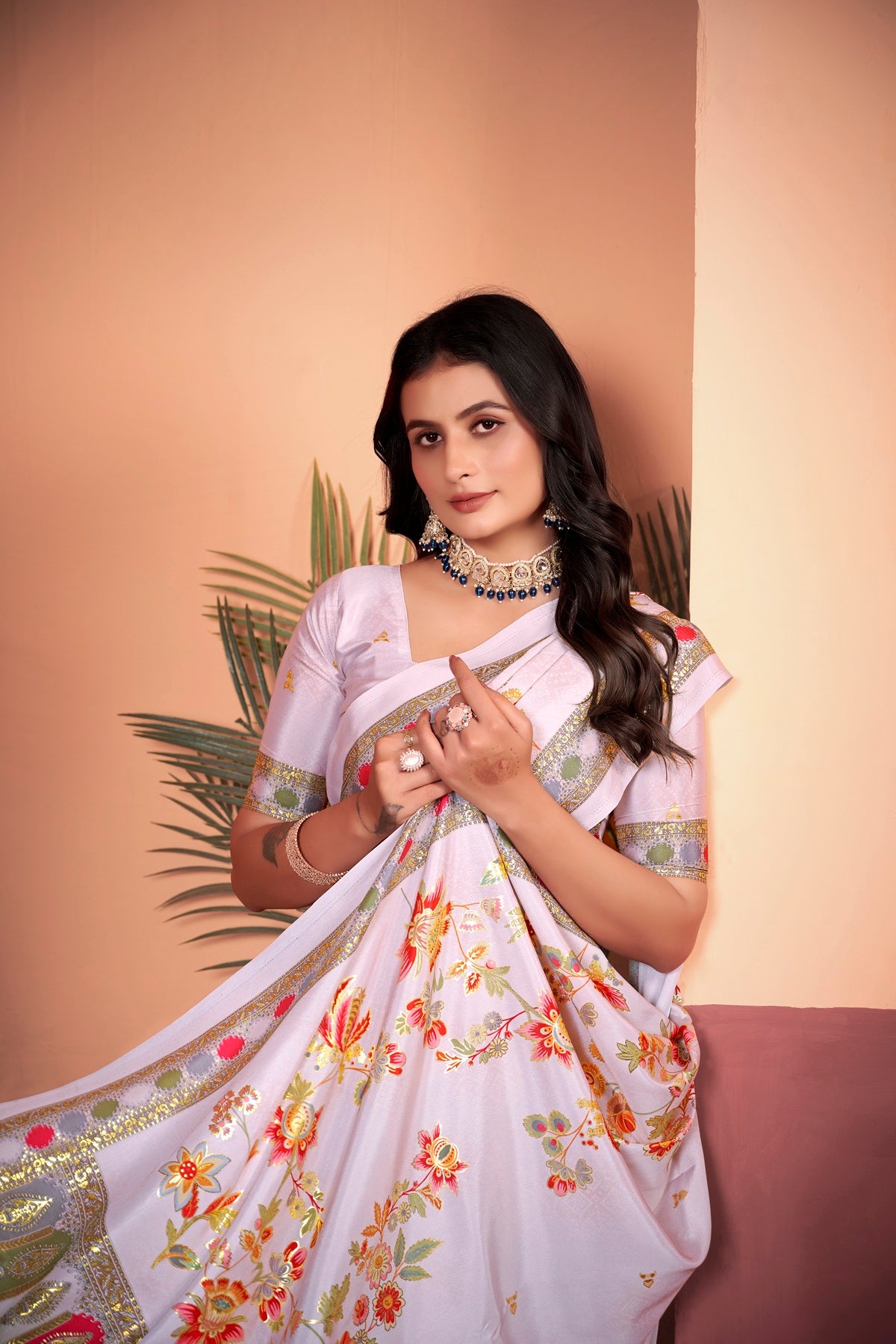 Graceful Off-White Saree with Positional Floral Print & Foil-Embellished Pallu