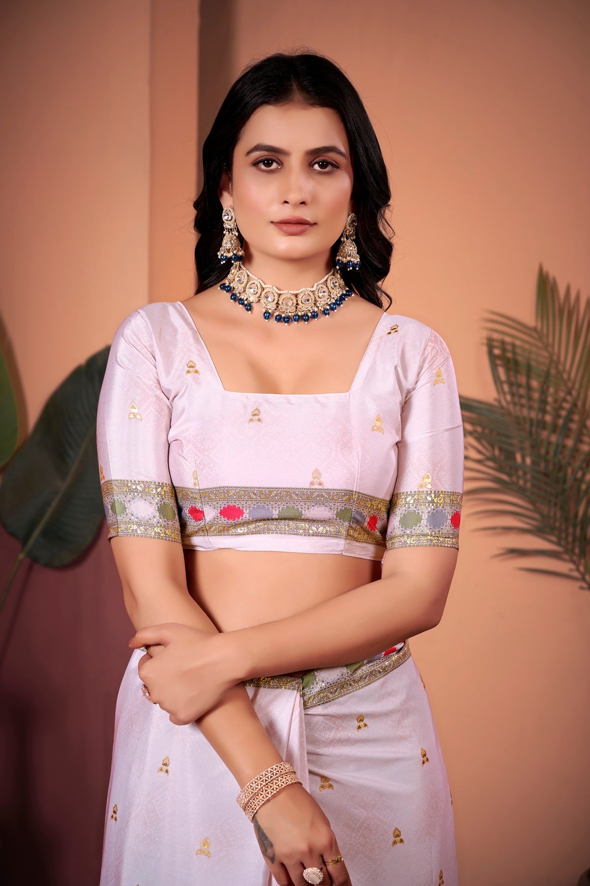 Embrace timeless elegance with this off-white saree, adorned with a positional floral print and foil detailing that adds a touch of subtle radiance. The saree features a beautifully designed foil-enhanced pallu, enhancing its charm with a graceful shimmer. Perfectly complemented by a butti ethno floral taste unstitched blouse piece, this saree strikes the perfect balance between tradition and modern sophistication, making it an ideal choice for festive gatherings, weddings, and special occasions.