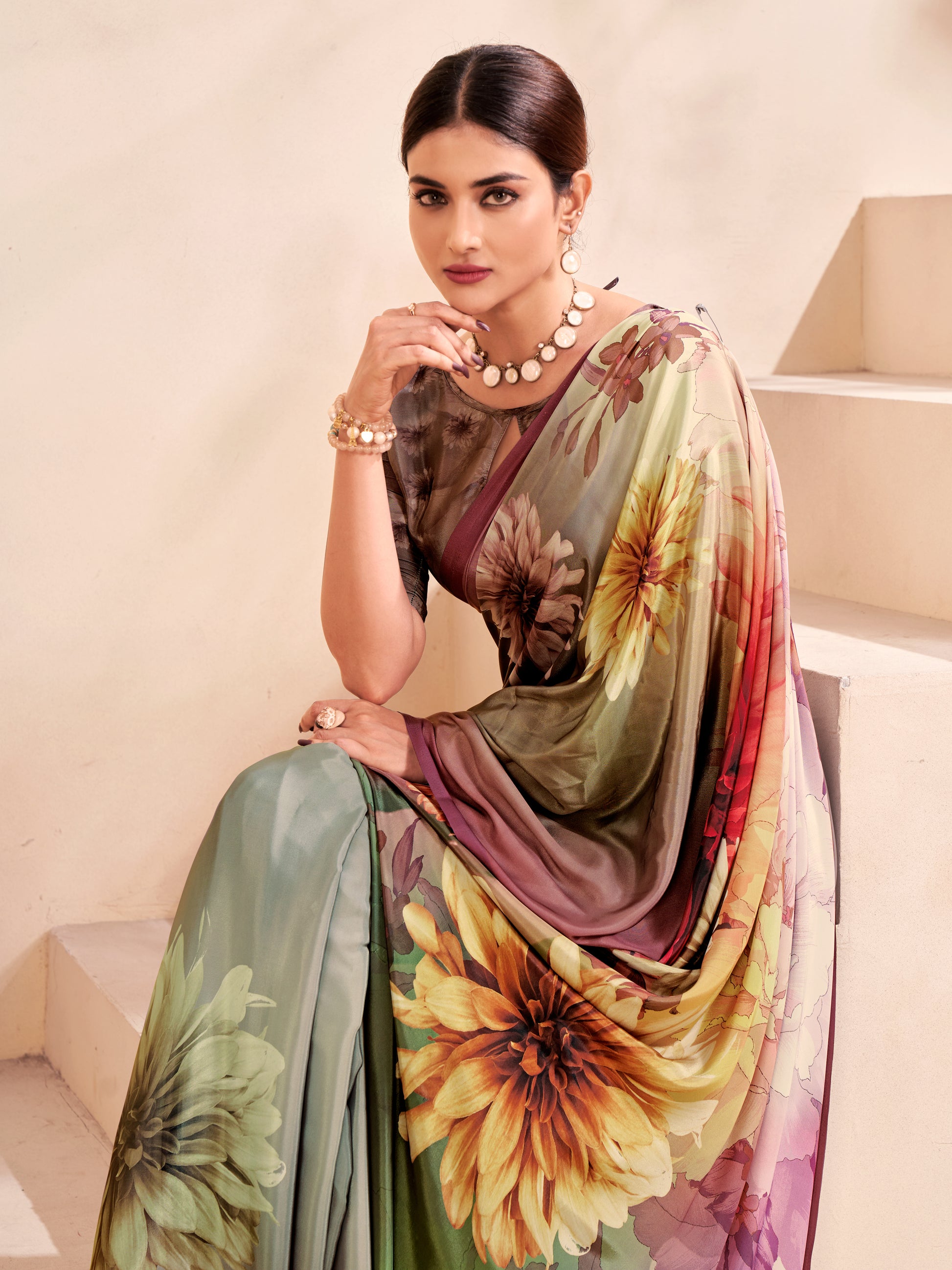 Jivora Women Crepe Soft Silk Striped And Floral Printed Saree with Unstitched Blouse.