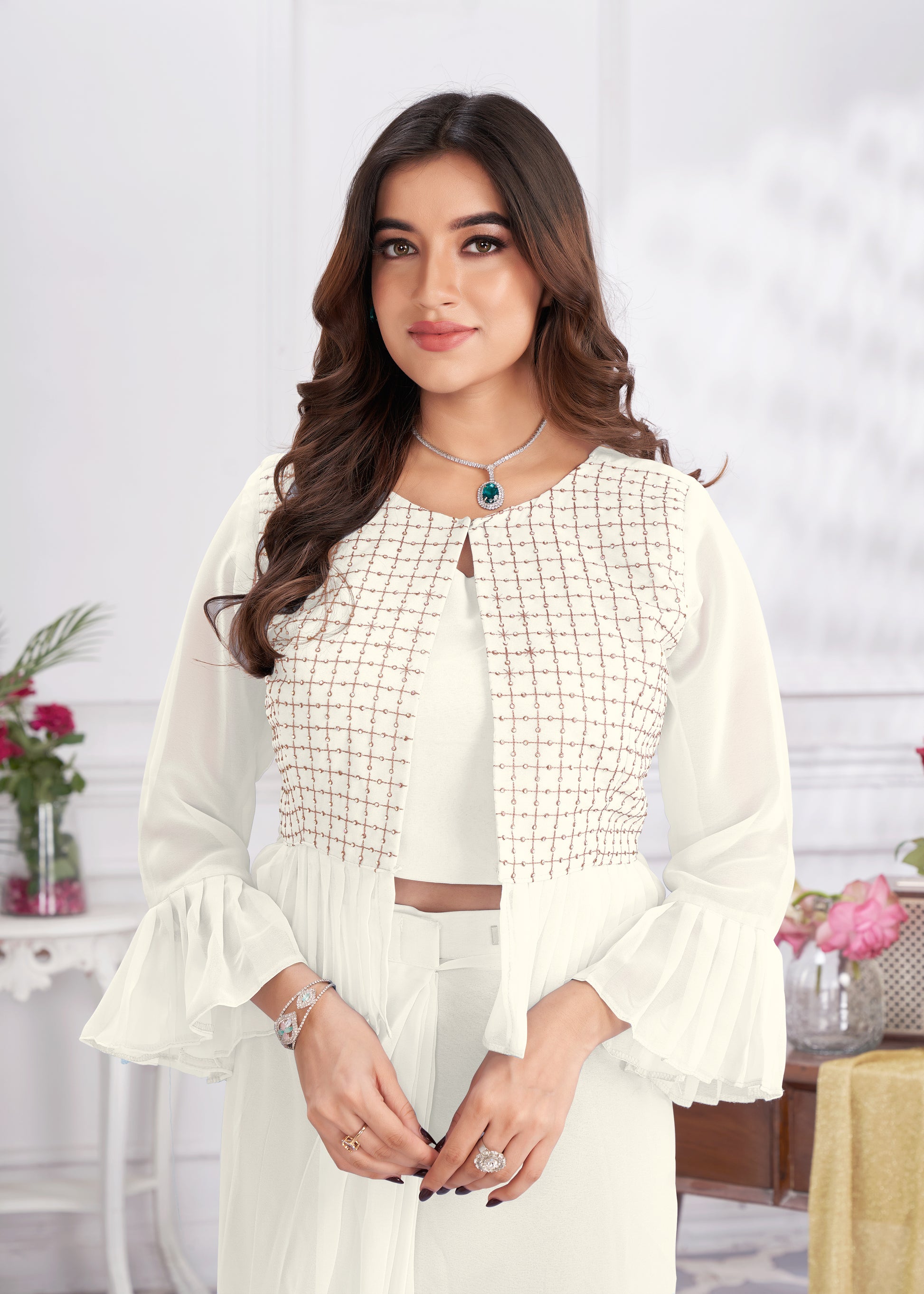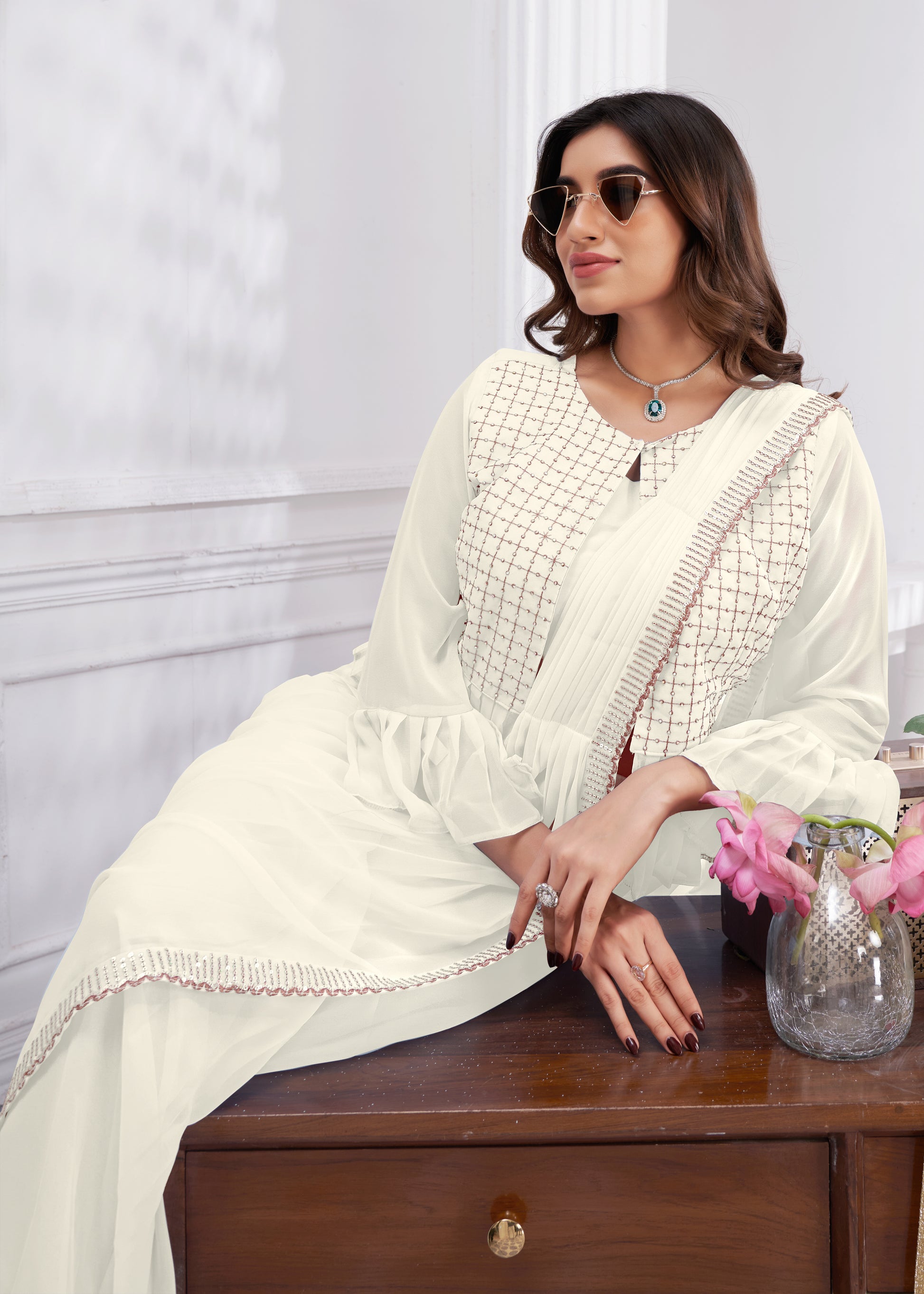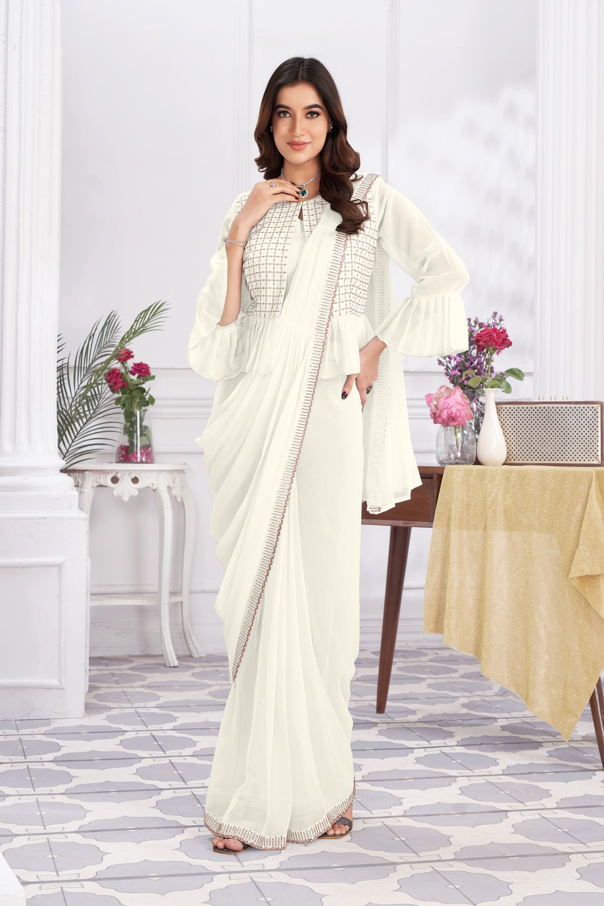 Premium Georgette Ready to Wear Saree & Stitched Blouse With Embroidery And Sequins Work Stitched Pallu Fancy Drape Sarees