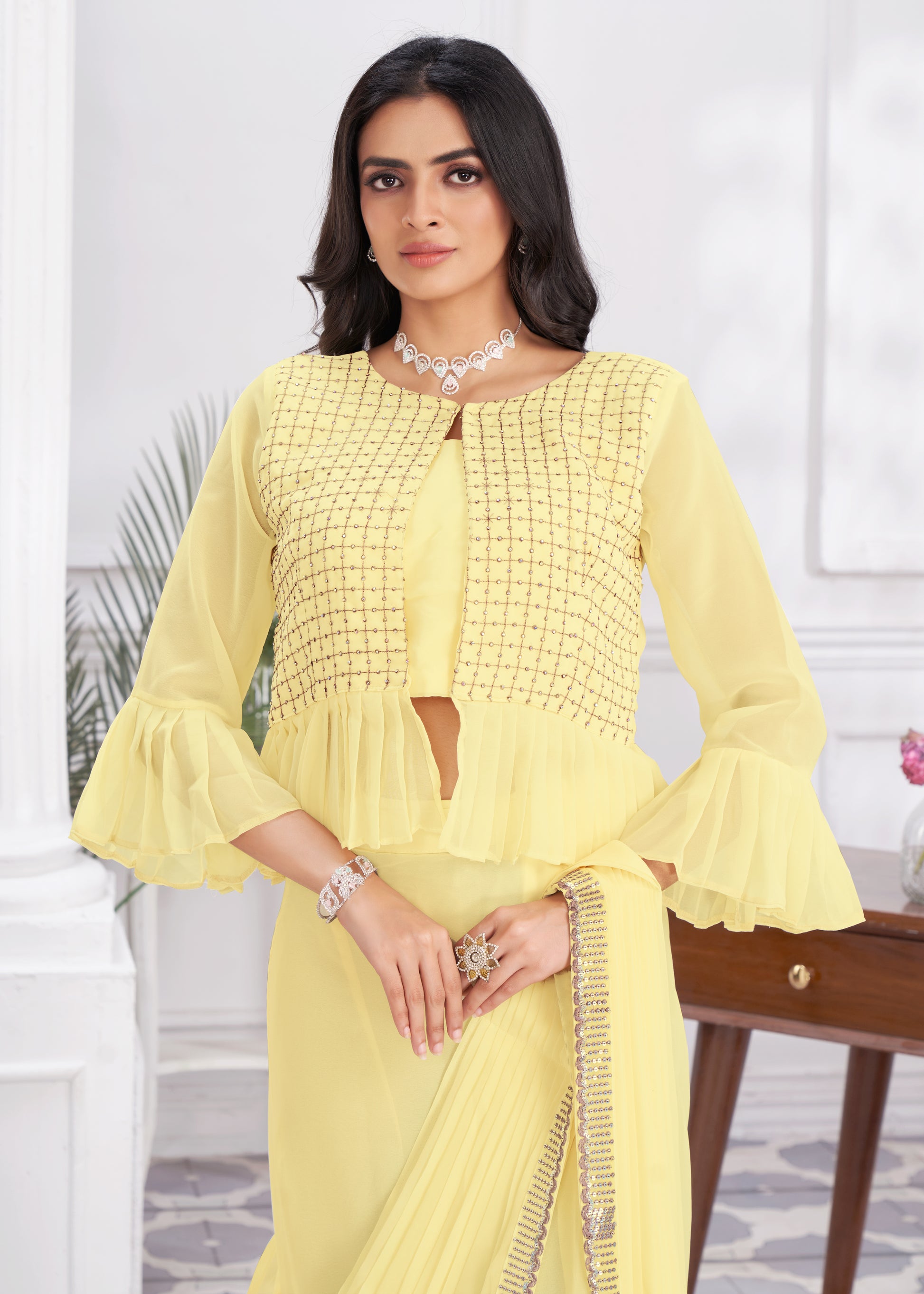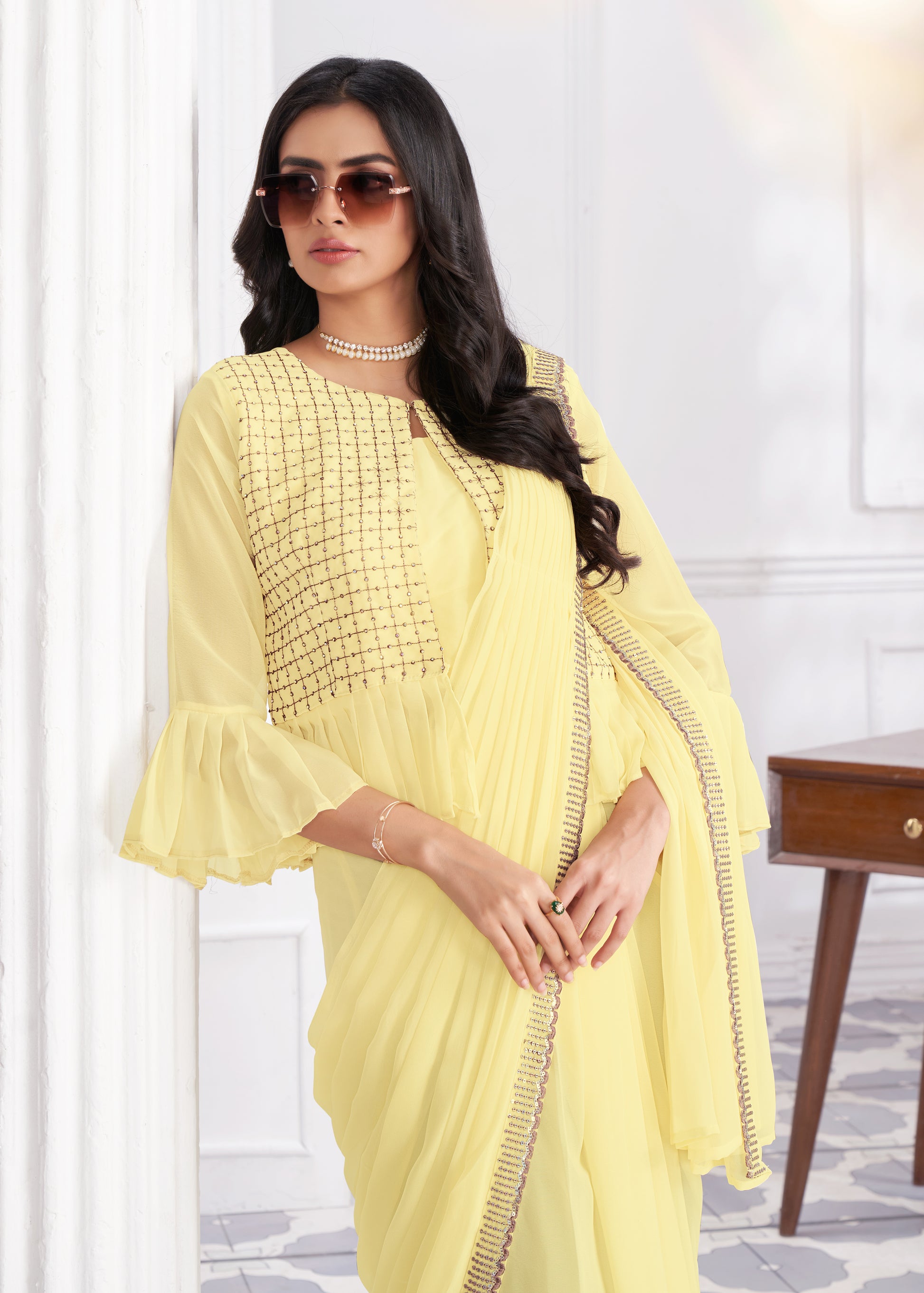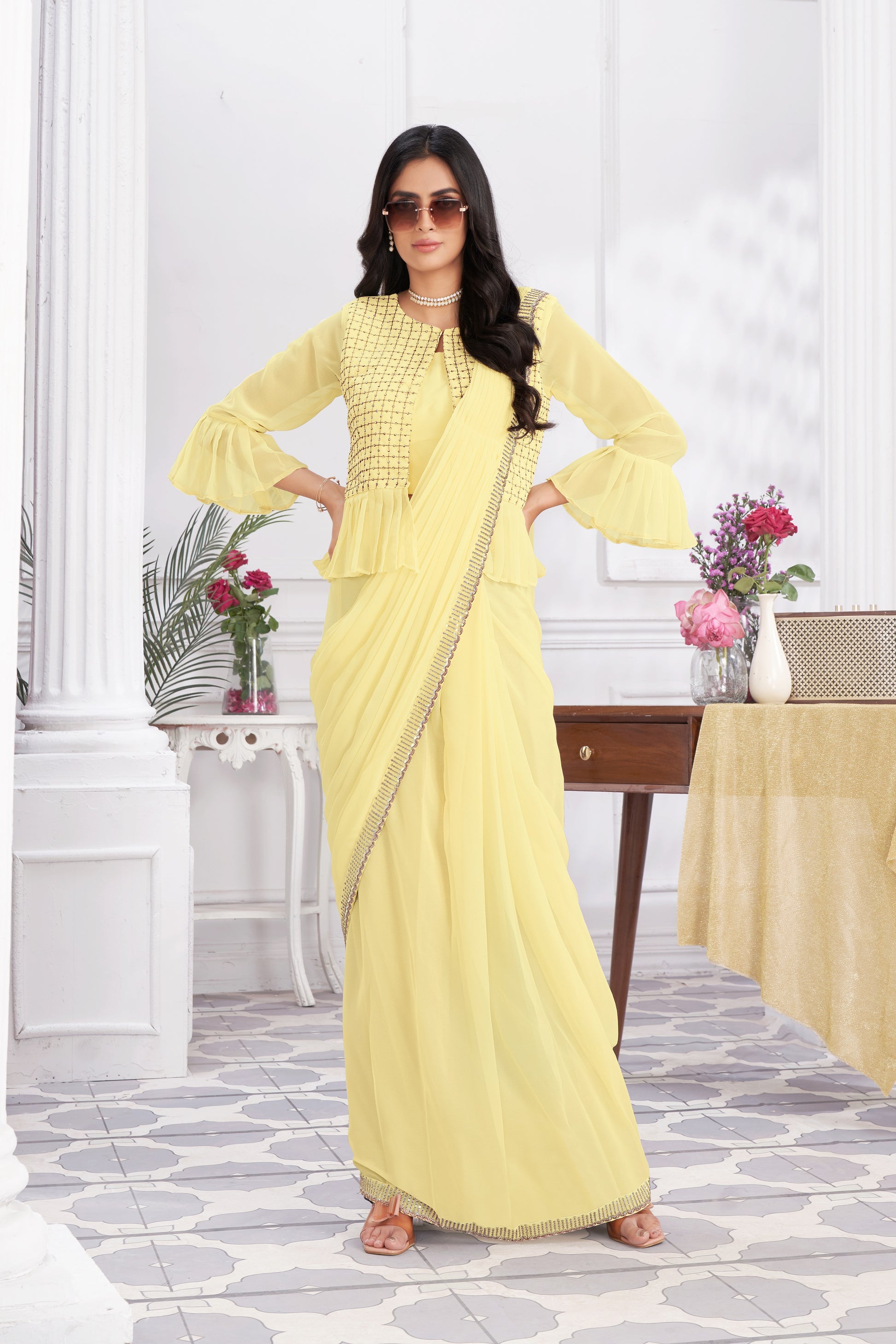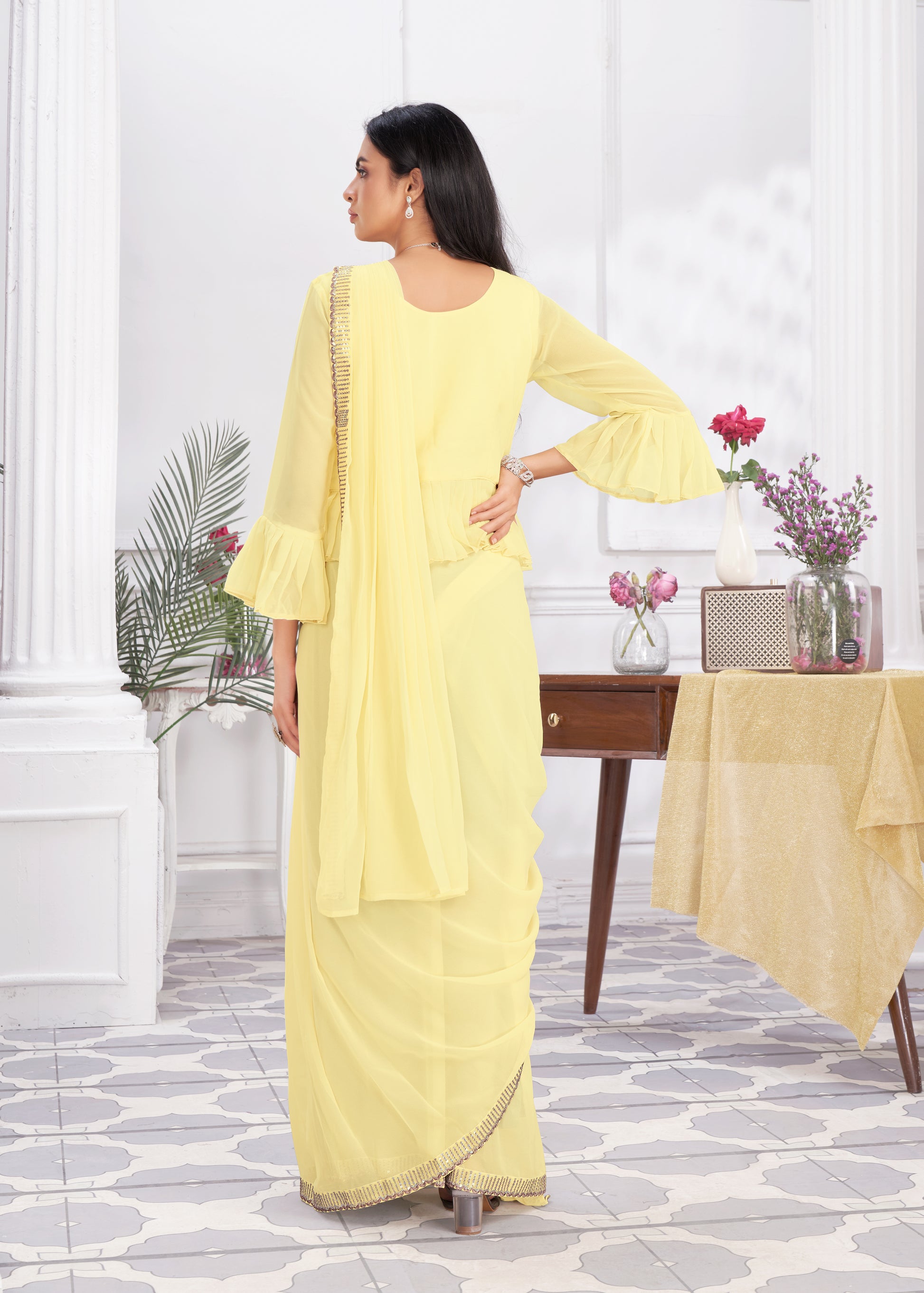 Premium Georgette Ready to Wear Saree & Stitched Blouse With Embroidery And Sequins Work Stitched Pallu Fancy Drape Sarees