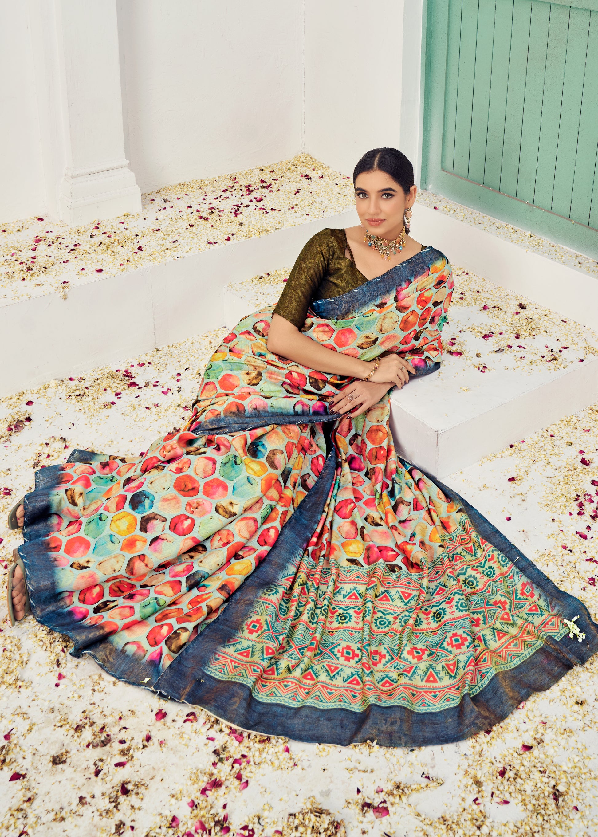 Premium Natural Silk Viscose With Pure Jacquard Zari Woven In the fabric Digital Printed Work Saree