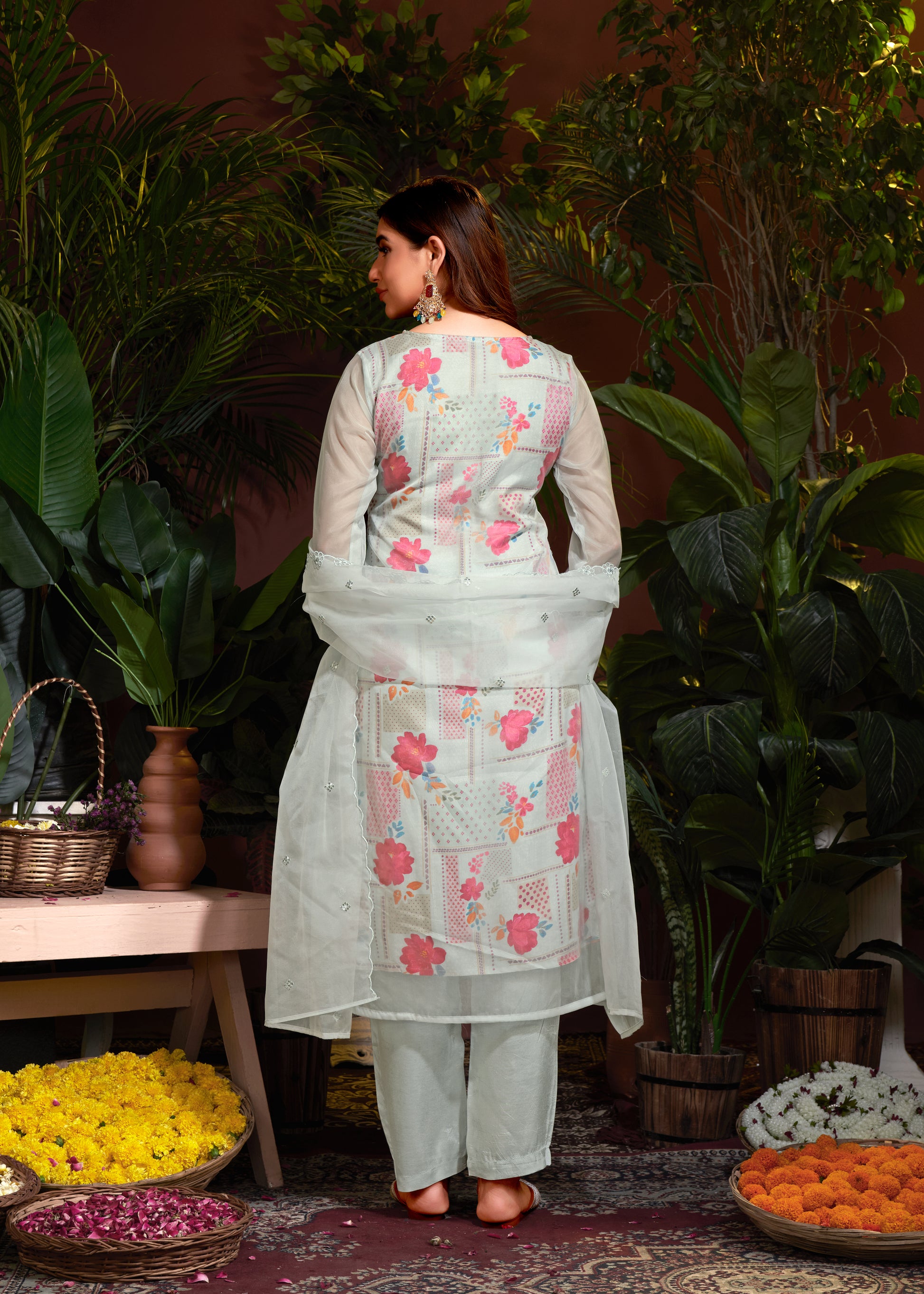 Premium Organza With Digital Print Pure Muslin Inner Santoon Bootom Oraganza Dupatta Embroidery and Sequins Daman & Neck Work With Hand Work Salwar Kameez Dupatta 3 Pcs Set