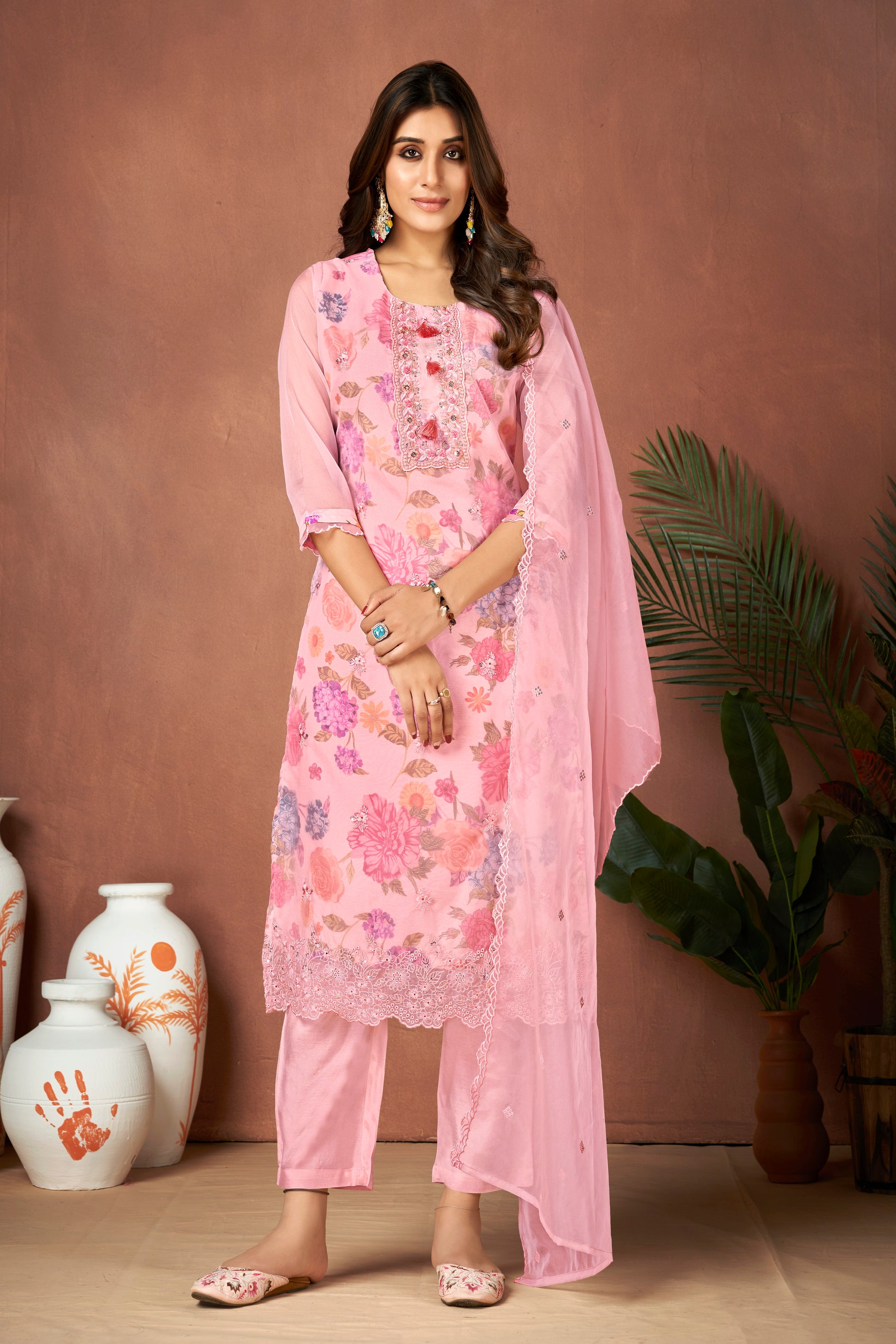 Premium Organza With Digital Print Pure Muslin Inner Santoon Bootom Oraganza Dupatta Embroidery and Sequins Daman & Neck Work With Hand Work Salwar Kameez Dupatta 3 Pcs Set