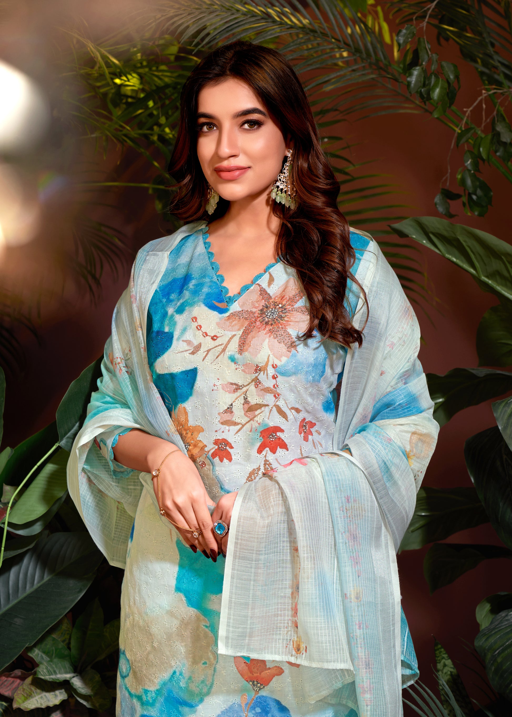 Premium Pure Linen Cotton Fabric Bottom Pure Cotton Poly Chanderi Dupatta Digital Print & Schiffli With Embroidery & Hand Work Salwar Kameez Dupatta 3 Pcs Set