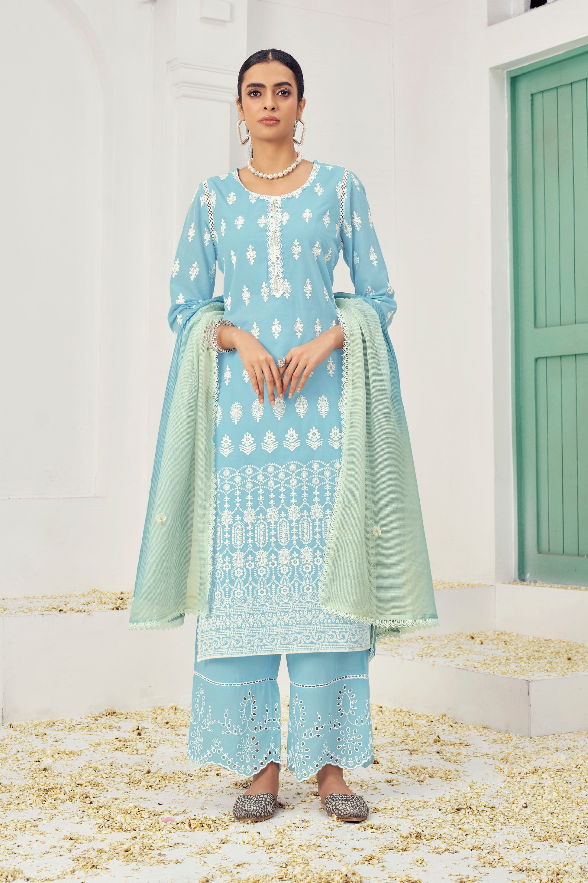 Premium Pure Cotton Top Bottom Fabric Poly Chanderi Dupatta Lakhanvi Style Boring Embroidery Work Salwar Kameez Dupatta 3 Pcs Set