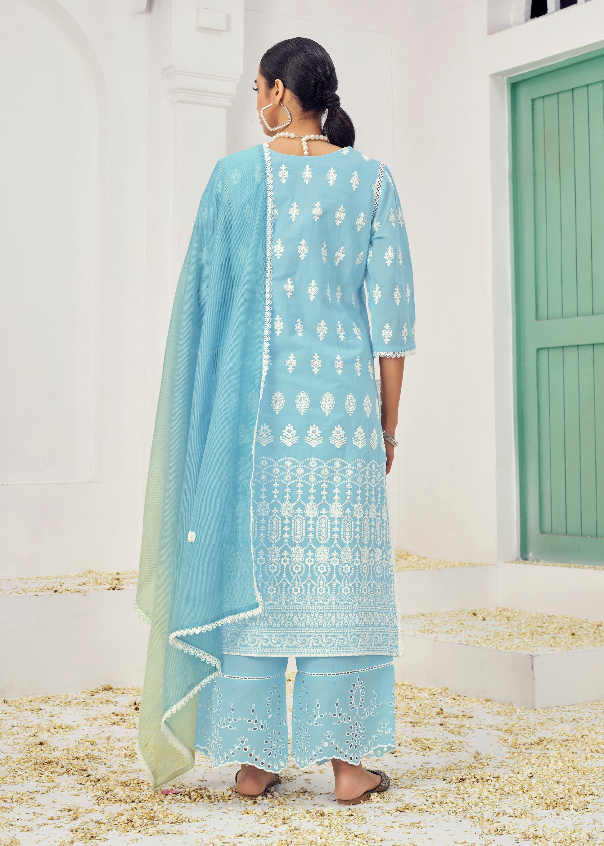 Premium Pure Cotton Top Bottom Fabric Poly  Chanderi Dupatta Lakhanvi Style Boring Embroidery Work Salwar Kameez Dupatta 3 Pcs SetÂ