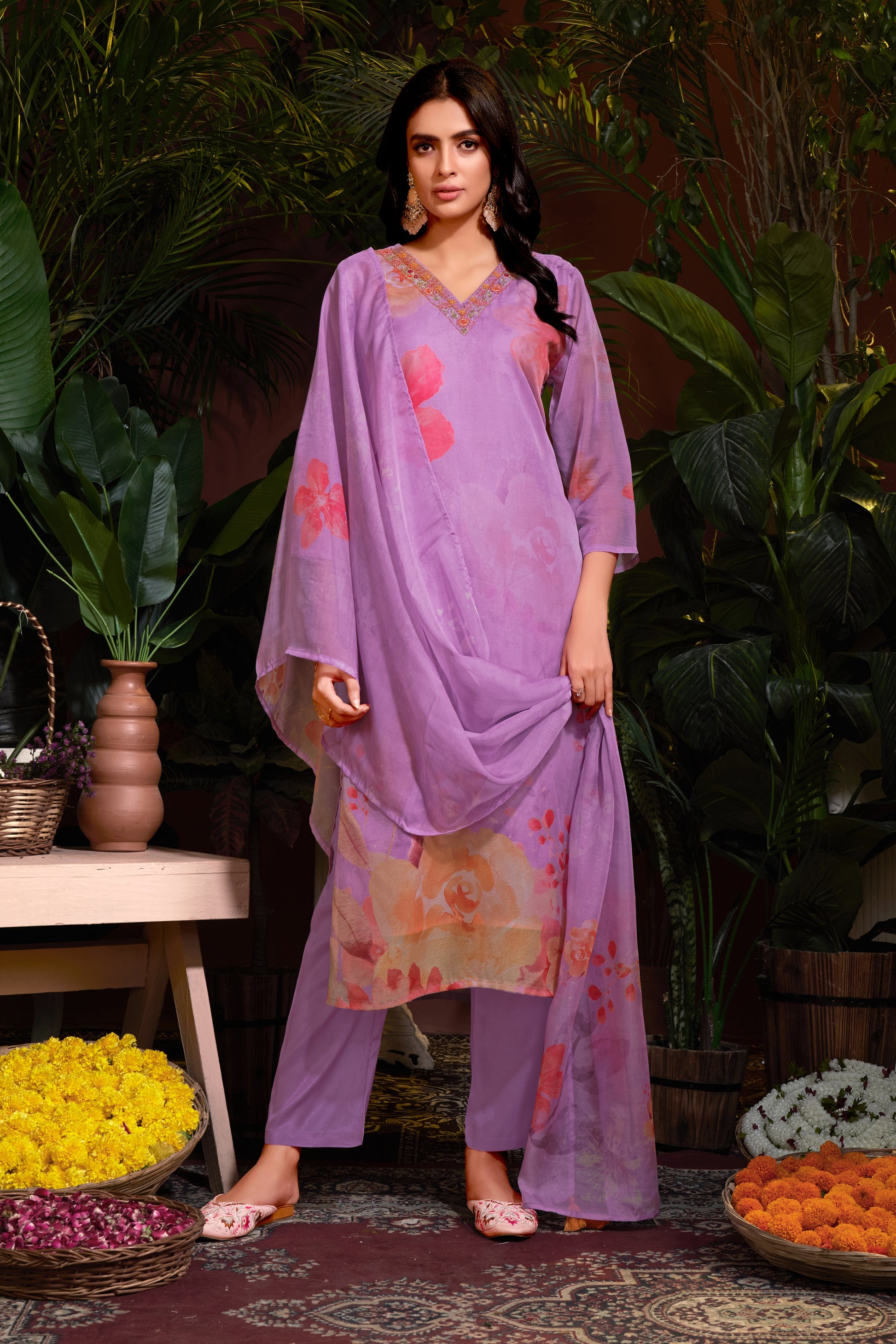Premium Organza with Digital Print Pure Muslin Inner Santoon Bottom Fabric Oraganza Dupatta V Neck With Hand Work & Sequence Salwar Kameez Dupatta 3 Pcs Set