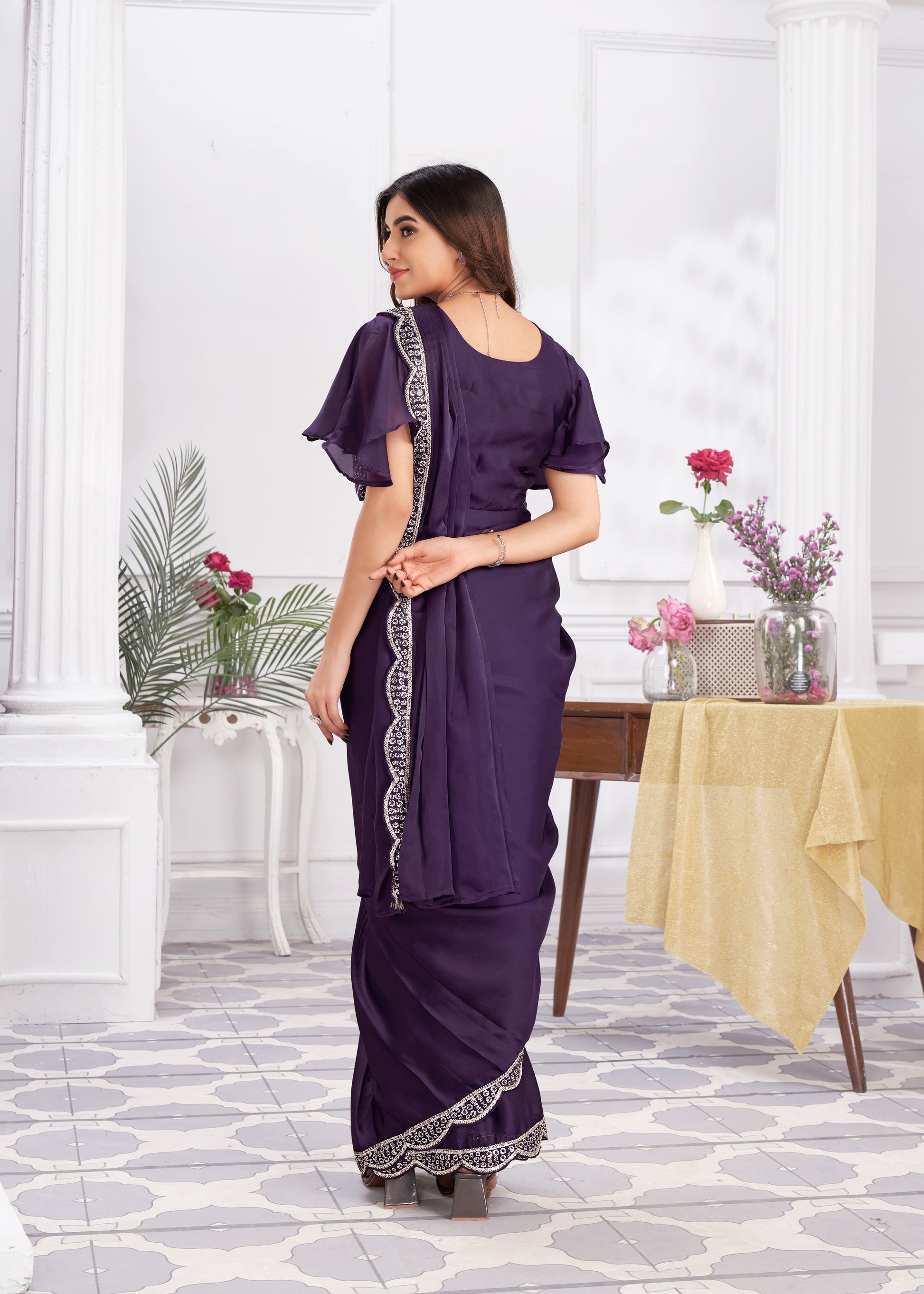 Premium Satin Silk Ready to Wear Saree & Stitched Blouse With Embroidery And Sequins Work Stitched Pallu Fancy Drape Sarees