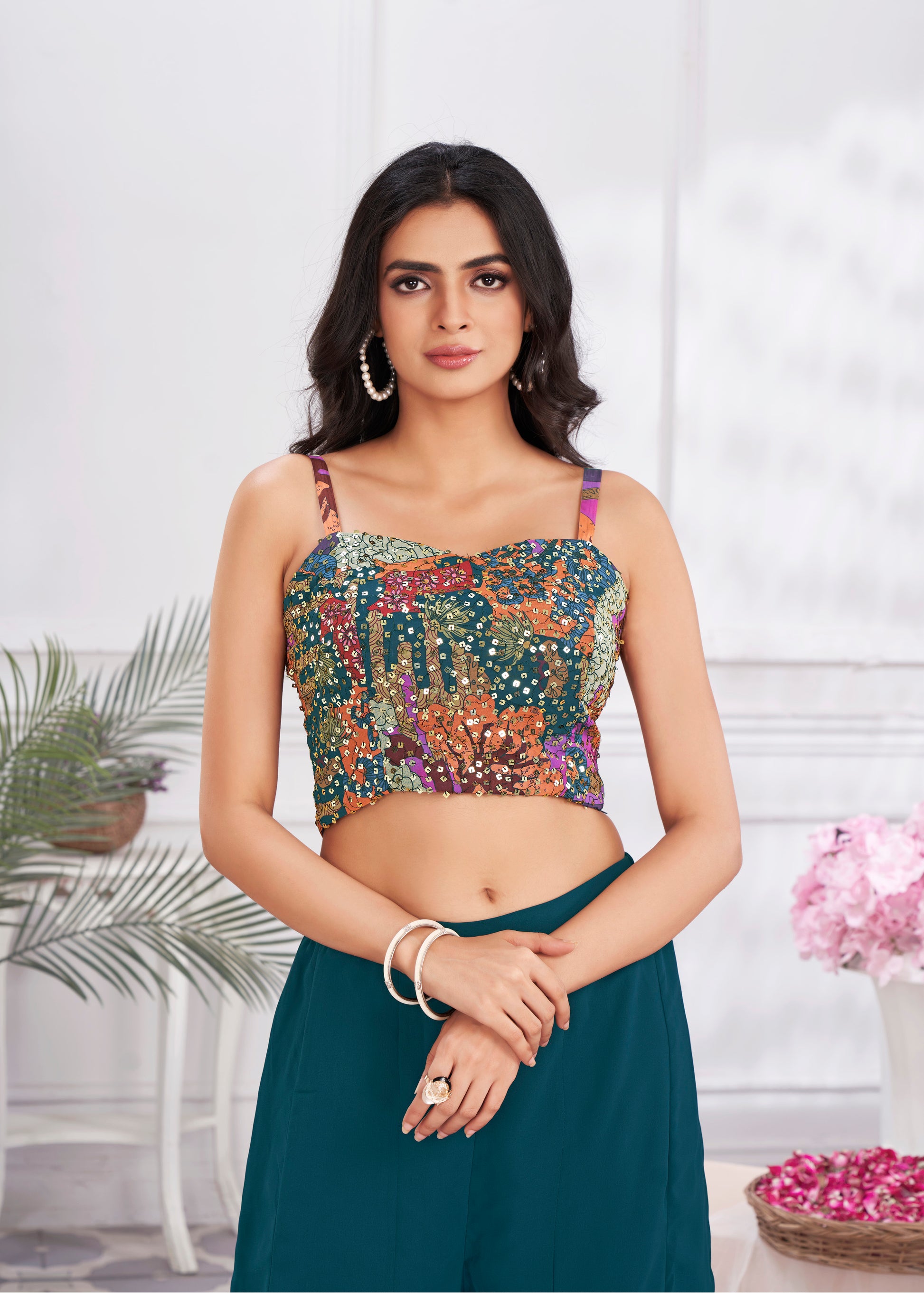 Premium Shimmer Georgette & Fancy Fabric Embroidery & Hand Work Fancy Crop Top/Sharara & Choli