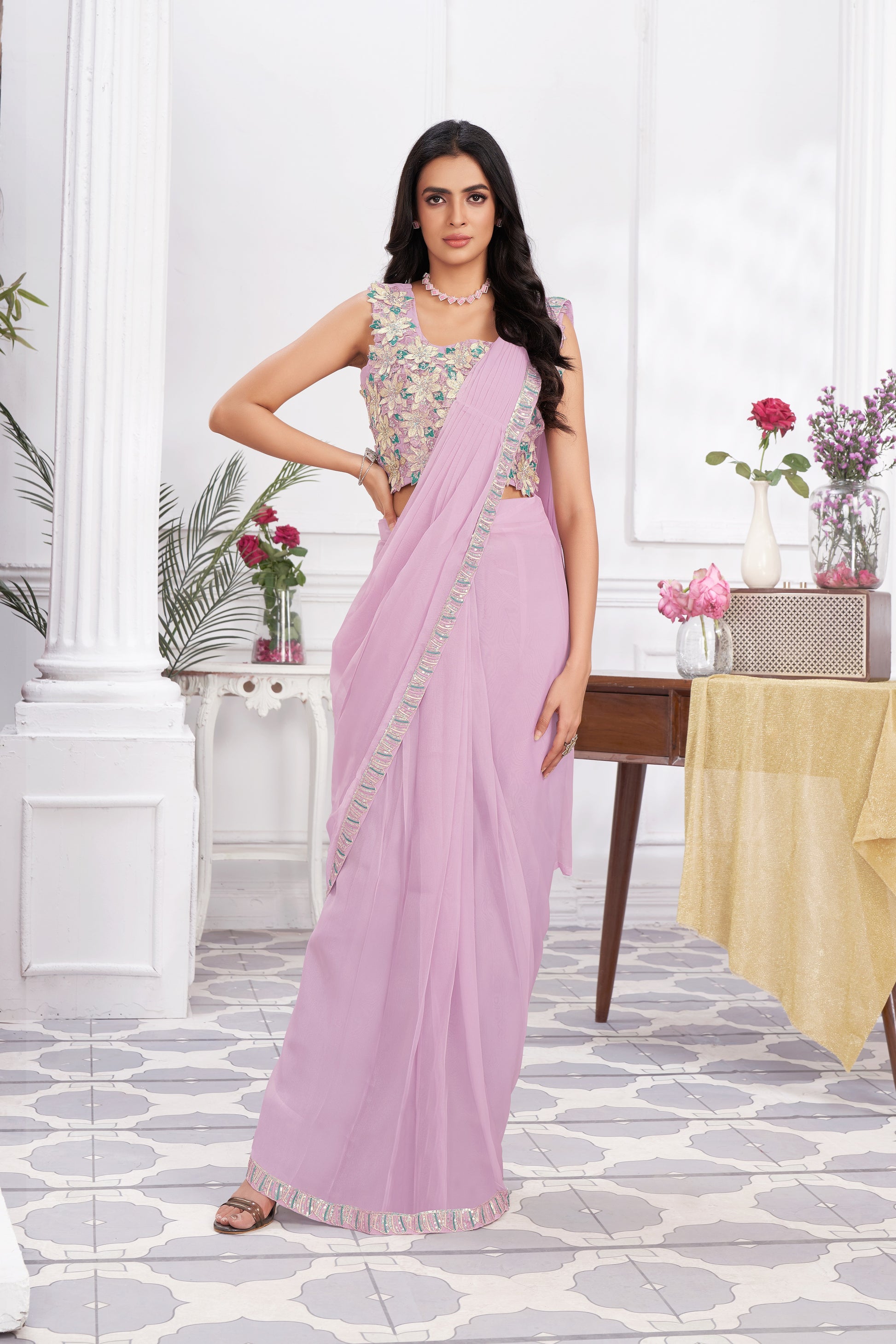 Premium Shimmer Georgette Ready to Wear Saree & Stitched Blouse With Embroidery And Sequins Work Stitched Pallu Fancy Drape Sarees